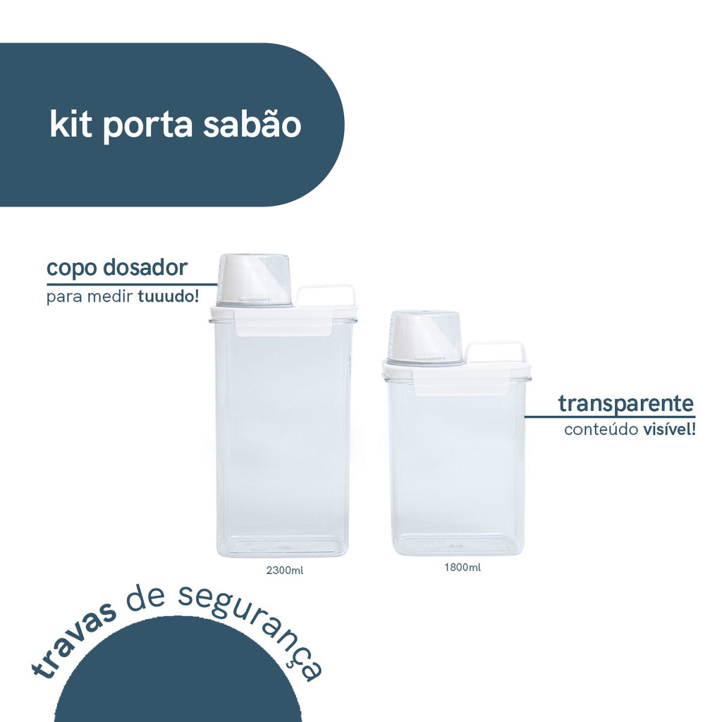 "conheça o kit com 2 porta sabão em pó 1,8L e 2,3L com copo dosador e travas da oikos! ideais para lavanderia, possuem copo dosador para medir as quantidades exatas, têm alça para facilitar o transporte e travas para evitar vazamentos! armazene sabão em pó, líquido, amaciante, detergente e o que você quiser. dica para todos #oikolovers: eles são suuuper multiuso! você pode utilizar até na cozinha para colocar e medir grãos, temperos, aveia, açúcar, café e outros alimentos. são de plástico e possuem aneis de silicone. podem ser lavados na água corrente com esponja e sabão neutro. não podem ir na lava louças. leve praticidade e modernidade para sua casa! o kit contém: 1 porta sabão em pó 1,8L com dosador e travas comprimento: 13cm | largura: 8cm | altura: 24cm 1 porta sabão em pó 2,3L com dosador e travas comprimento: 13cm | largura: 8cm | altura: 30cm"