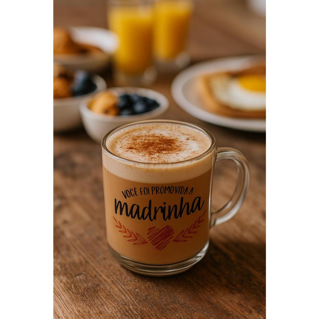 Kit 2 Canecas de Vidro – Padrinho e Madrinha Surpreenda quem você ama com um presente cheio de significado! Este kit contém 2 canecas de vidro personalizadas, uma com a frase “Você foi promovida a madrinha” e outra com “Você foi promovido a padrinho”. ✨ Características: Material: Vidro de alta qualidade Capacidade: 230ml Altura: 8,5 cm Diâmetro: 7 cm Alça anatômica para maior conforto Estampa resistente Perfeitas para café, cappuccino, chá ou qualquer bebida quente, essas canecas unem delicadeza e praticidade, tornando o momento ainda mais especial. 💝 Ideal para anunciar a escolha dos padrinhos ou presentear em ocasiões especiais. ------------------------------------Nine Personaliza------------------------------------