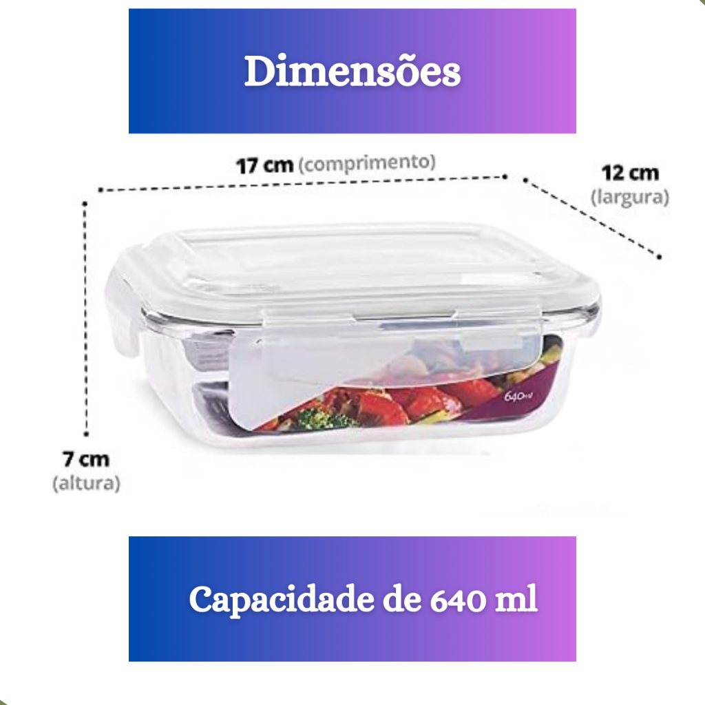 Conjuntos com 3 a 12 Potes de Vidro Retangular Tampa Hermética 370ml, 640ml, 1040ml O pote hermético de vidro é ideal para o seu dia a dia. • Anel de silicone removível; • Possui super travas; • Mantém os alimentos frescos por mais tempo; • Suporta uma variação térmica de até 300°C (NÃO É INDICADO DAR CHOQUE TÉRMICO); • Evita que o cheiro se espalhe devido a sua super vedação; • Vai ao forno convencional (sem a tampa), forno elétrico (sem a tampa), micro-ondas (sem a tampa) e freezer; • Tampa livre de BPA (Bisfenol A), ou seja, não é tóxica; • Fácil de limpar e higienizar, pois pode tirar o anel de silicone e vedação para limpeza; • Sem risco de vazamento devido a sua super vedação; • Super resistente. Envio com nota fiscal
