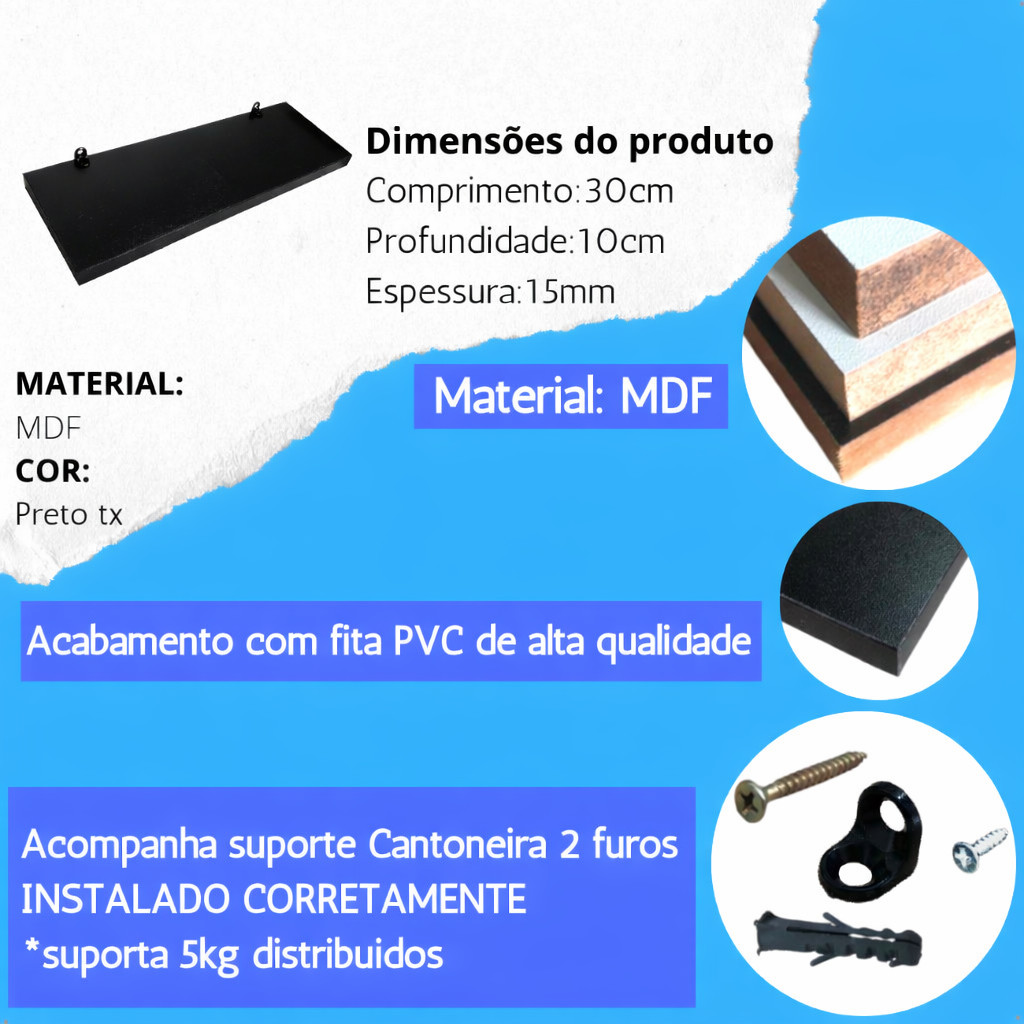 ENVIO IMEDIADO...... Kit com 3 prateleira 100% MDF -TAMANHO.... Comprimento: 30cm Profundidade: 10cm Cores Disponíveis: -BRANCO TX -PRETO TX -MDF NATURAL Acompanha o kit de instalação; -Buchas, Parafusos e Cantoneiras