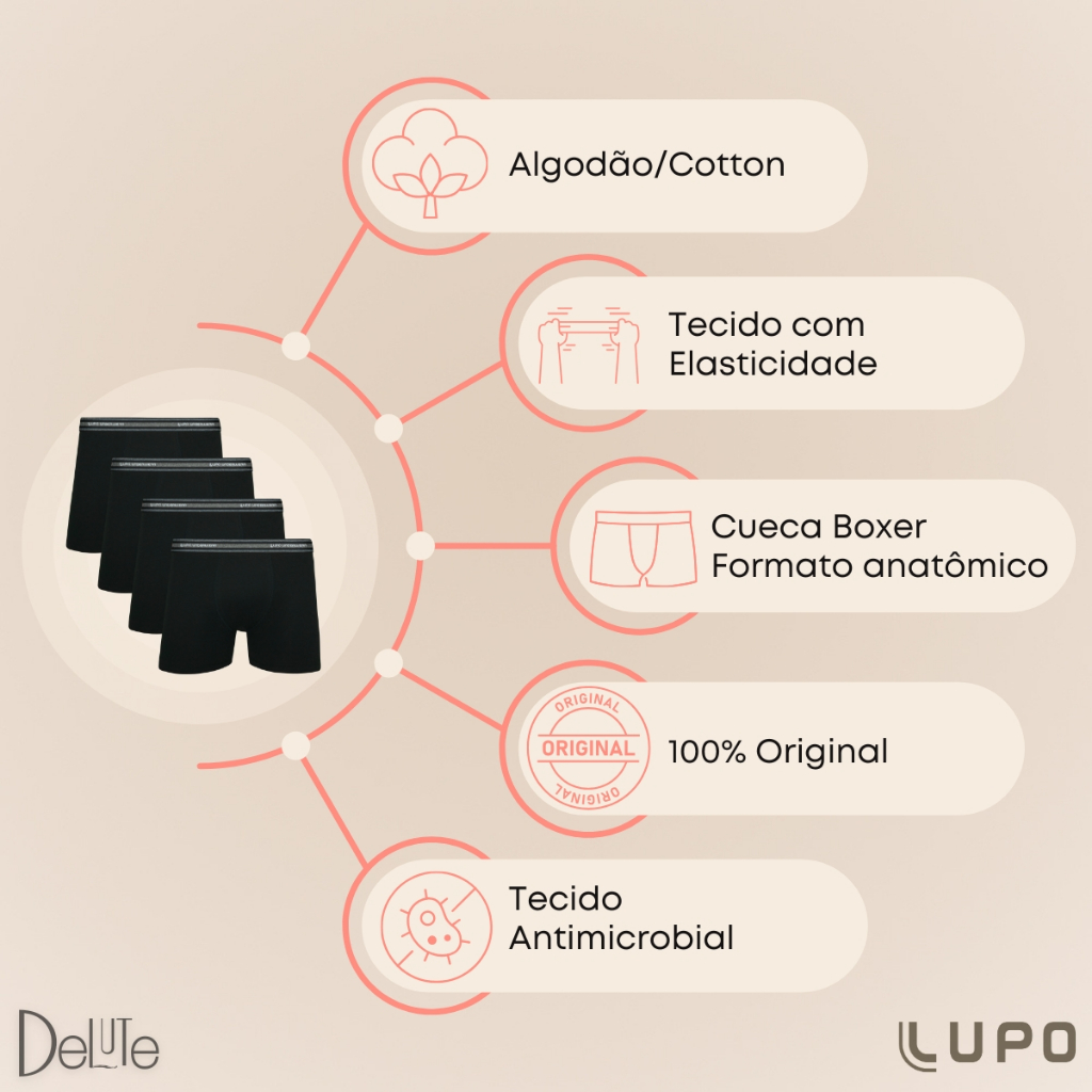Kit De 4 Cuecas Originais Lupo Boxer Box Básica Em Algodão Cotton Com Elastano