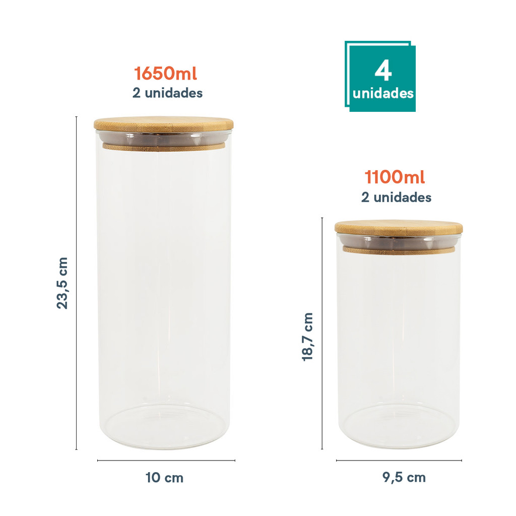 Kit de 4 Potes de Vidro Herméticos Tampa de Bambu - OIKOS