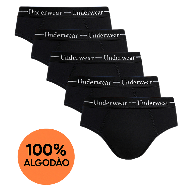 Kit de 5 Cueca Preta com Cós Elástico 100% algodão Modelo Básico Masculino Super Confortável