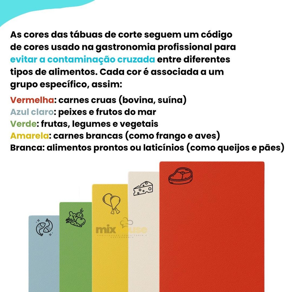 ENVIO IMEDIATO VISITE NOSSA LOJA TEMOS DIVERSOS PRODUTOS E OPORTUNIDADES IMPERDIVEIS PARA VOCÊ Kit com 5 Tábuas de Corte em Polietileno 30x25cm – 6mm + Suporte Organizador Organize sua cozinha de forma prática, segura e profissional com este kit completo contendo 5 tábuas de corte coloridas em polietileno e um suporte exclusivo para mantê-las sempre à mão e bem armazenadas. Cada tábua é fabricada em polietileno atóxico e resistente, ideal para o manuseio seguro de alimentos. O material não absorve líquidos, odores e é gentil com o fio das facas, além de ser fácil de higienizar. Com dimensões de 30x25 cm e espessura de 6 mm, são perfeitas tanto para uso doméstico quanto profissional. O kit inclui 5 tábuas nas cores: Branco – para pães, laticínios e frios Azul – para peixes e frutos do mar Amarelo – para carnes de aves Verde – para frutas, legumes e verduras Vermelho – para carnes bovinas e suínas Acompanha um suporte organizador exclusivo, que mantém as tábuas em pé, ventiladas e separadas por cor, evitando contaminação cruzada e garantindo praticidade no dia a dia. Ideal para cozinhas que seguem normas de higiene e segurança alimentar, como o padrão HACCP.
