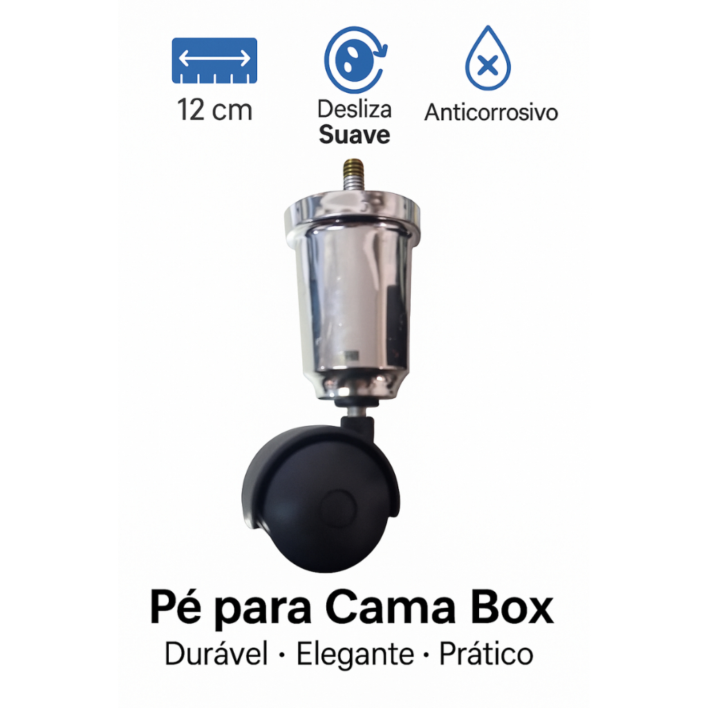 Kit com 4 Pés com Rodinha Cromados 12cm – Para Cama Box, Baú, King e Solteiro Funcionalidade, mobilidade e elegância para sua cama! O Kit com 4 Pés com Rodinha Cromados 12cm é a escolha ideal para quem busca movimentar a cama com facilidade, sem abrir mão da resistência e do bom acabamento. Compatível com camas box, camas baú, modelos King, Queen e Solteiro, oferece suporte firme e deslizamento suave. Com estrutura metálica cromada e durável, esse kit possui rodinhas de alta qualidade que facilitam a limpeza do ambiente e o reposicionamento do móvel. 🛏️ Compatível com Diversos Modelos: Ideal para camas box, camas baú, solteiro, casal, queen e king. 🔄 Mobilidade com Segurança: Rodinhas resistentes com bom giro e fixação estável. ✨ Visual Sofisticado: Acabamento cromado que combina com qualquer ambiente. 💪 Alta Capacidade de Carga: Suporta o peso da cama e dos usuários com firmeza. 🔧 Fácil Instalação: Sistema de rosca padrão (M8 – 8mm), sem necessidade de ferramentas especiais. Tecnica: Altura Total: 12 cm Material: Metal cromado + rodízio plástico/resistente Rosca: M8 (8mm) – padrão Ortobom e similares Cor: Prata (Cromado) Indicação: Cama Box, Cama Baú, Cama King, Queen, Casal e Solteiro