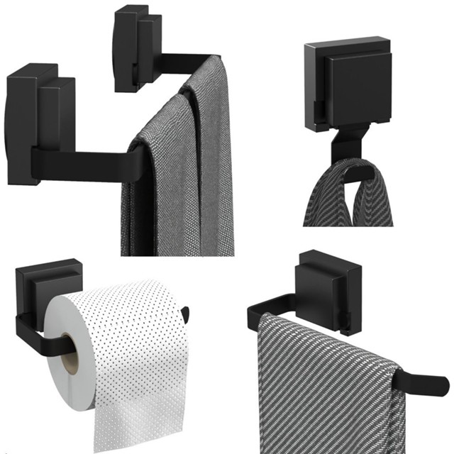 Kit de Acessórios Com Ventosa Para Banheiro Preto 4 Peças Linha F.Max