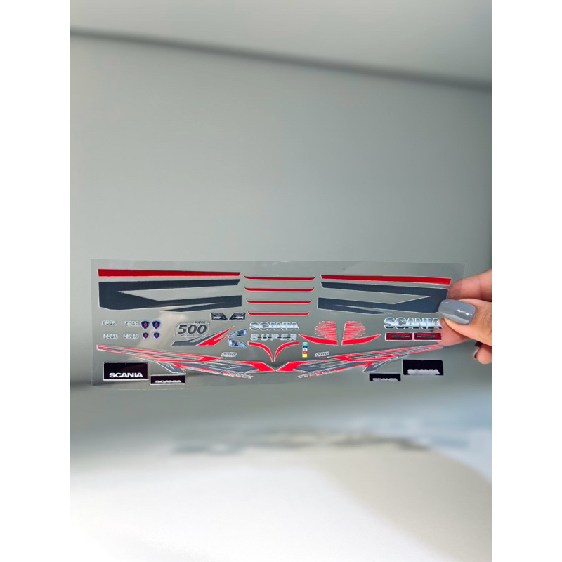 Kit de adesivos DTF miniatura Scania super 500 scala 1:32 Para cabine 3D O kit é composto por: • Adesivos de Faixas • Adesivos de Lanternas • Adesivos de emblemas • Adesivos de lameiras Obs.: Valor unitário referente a um kit.