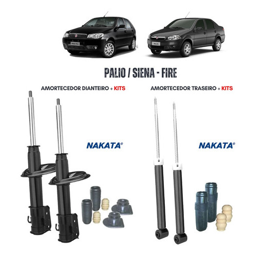 CONTEÚDO DA EMBALAGEM (KIT): 02 AMORTECEDORES SUSPENSÃO DIANTEIROS ESQ/DIR - NAKATA CÓD. HG33004 02 AMORTECEDORES SUSPENSÃO TRASEIROS ESQ/DIR - NAKATA CÓD. HG31039 02 KITS P/ AMORTECEDORES DIANTEIROS / BATENTE / COXIM COM ROLAMENTO E COIFA 02 KITS P/ AMORTECEDORES TRASEIROS / BATENTE E COIFA PRODUTOS NOVOS, ORIGINAIS, COM GARANTIA E NOTA FISCAL. APLICAÇÃO: FIAT PALIO FIRE - 2001 A 2015 FIAT SIENA FIRE - 2001 A 2012 ATENÇÃO: A RESPONSABILIDADE DA COMPATIBILIDADE DO PRODUTO E SUA APLICAÇÃO É DO COMPRADOR; NÃO NOS RESPONSABILIZAMOS POR PREJUÍZOS ADVINDOS DA APLICAÇÃO INCORRETA DO PRODUTO. CONSULTE O FABRICANTE DO SEU EQUIPAMENTO E CONFIRME A COMPATIBILIDADE COM O INSTALADOR. A MARTINS AUTOPEÇAS DISPÕE DE PEÇAS AUTOMOTIVAS PARA TODA A LINHA LEVE E MÉDIA DE VEÍCULOS, SE NÃO ENCONTRAR O QUE PROCURA, DEIXE UMA PERGUNTA E RESPONDEREMOS O MAIS BREVE POSSÍVEL.