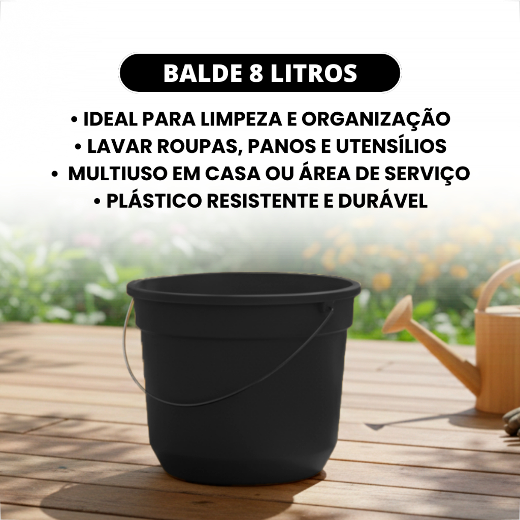 BALDE PLÁSTICO 8 LITROS – MULTIUSO O Balde Plástico 8 Litros é ideal para quem busca praticidade, resistência e versatilidade no dia a dia. Para uso doméstico, lavanderia, limpeza, organização e diversas tarefas do cotidiano. MEDIDAS: • Capacidade: 8 Litros • Altura: 21 cm • Diâmetro: 26 cm ESPECIFICAÇÕES: • Material: Plástico resistente e durável • Uso: Limpeza, lavanderia, organização e uso doméstico • Alça: Metálica reforçada para transporte seguro BENEFÍCIOS: • Multiuso: Ideal para limpeza, lavar roupas, panos, utensílios e organização. • Resistente: Produzido em plástico reforçado, garantindo maior durabilidade. • Prático: Leve, fácil de manusear e transportar. • Versátil: Pode ser usado na cozinha, banheiro, lavanderia ou área de serviço. • Design funcional: Formato que facilita o uso diário e o armazenamento. DICAS DE USO: • Ideal para uso doméstico, comercial ou profissional. • Utilize para limpeza geral, transporte de água, lavagem de roupas e organização. Escolha o Balde Plástico 8 Litros e tenha mais praticidade, resistência e eficiência nas tarefas do dia a dia!