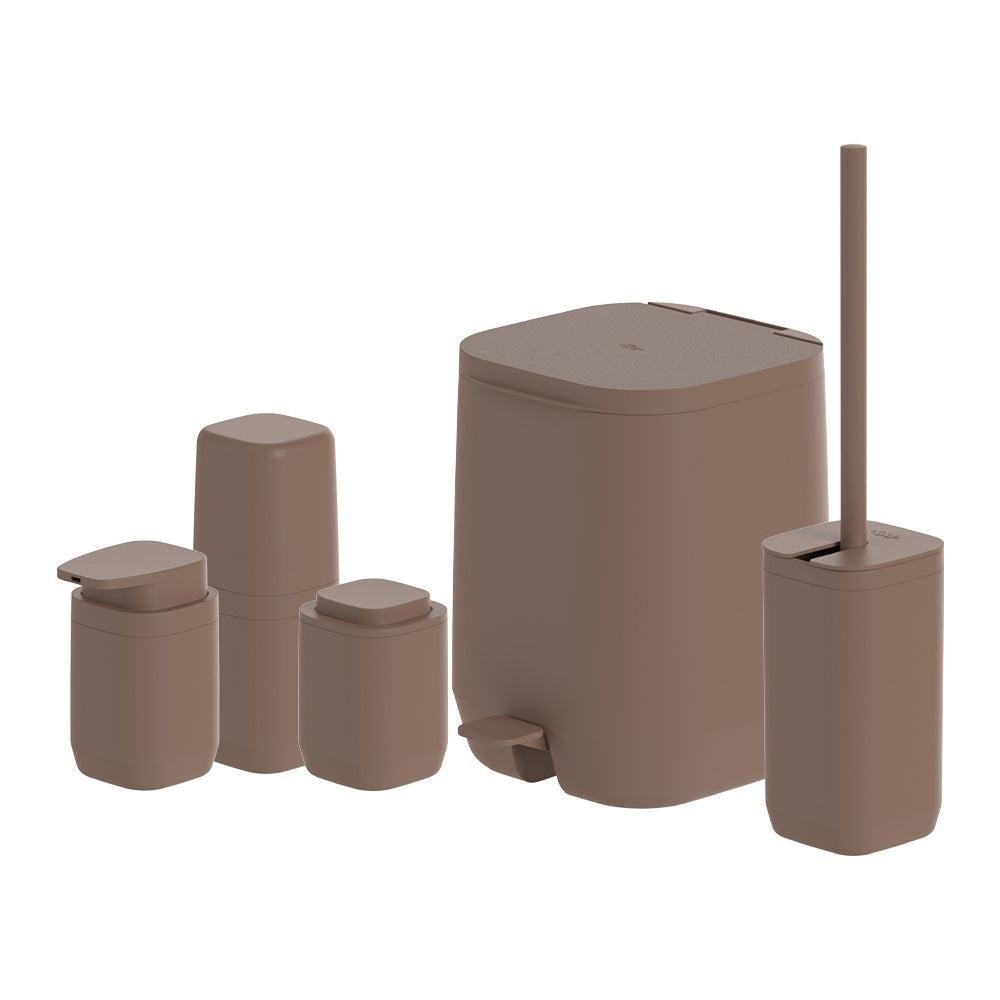 O Kit de banheiro completo Ou da Linha Aura conta com pedal, escova sanitária, difusor, porta sabonete líquido, porta escova de dente e porta algodão. Combinam praticidade e elegância facilitando seu uso diário. O design moderno dos produtos valoriza a decoração, enquanto o acabamento fosco traz sofisticação e suavidade, criando um ambiente digno de um spa em casa. INFORMAÇÕES TÉCNICAS Dimensões: LxAxP: 20x121x25 cm. Material: PS + NYLON + PVC +PP+ AÇO Cor: Marrom Amêndoa CUIDADOS Sugere-se higienizar com sabão neutro e esponja macia, evitando produtos abrasivos no processo de limpeza. Siga as instruções de instalação da embalagem. Ao retirar a película do adesivo, cuide para não encostar os dedos, evitando pequenas sujeiras ou oleosidade, e, ao aplicá-lo na parede, pressione-o bem, pois assim você garante a máxima aderência. Para remover, utilize um secador de cabelos e aqueça bem a área, para que a cola do adesivo fique maleável, facilitando a retirada. Importante: adesivo não reutilizável. CONTEÚDO DA EMBALAGEM 1 escova sanitária de piso/parede Ou Linha Aura. - Marrom Amêndoa 1 lixeira de pedal Ou Linha Aura. - Marrom Amêndoa 1 Porta sabonete líquido Ou da Linha Aura. - Marrom Amêndoa 1 porta escova de dentes Ou da Linha Aura. - Marrom Amêndoa 1 porta algodão Ou da Linha Aura. - Marrom Amêndoa SOBRE NÓS Somos apaixonados pelo que fazemos e utilizamos o design como meio de fazer você se sentir em casa onde estiver. Criamos produtos com carinho e cuidado para atender as suas necessidades diárias, levando bem-estar, aconchego e conforto para seu lar. Somos minimalistas e funcionais pois queremos que você tenha um estilo de vida mais leve e organizado, para atingir o máximo do seu potencial. Prazer, somos Ou.