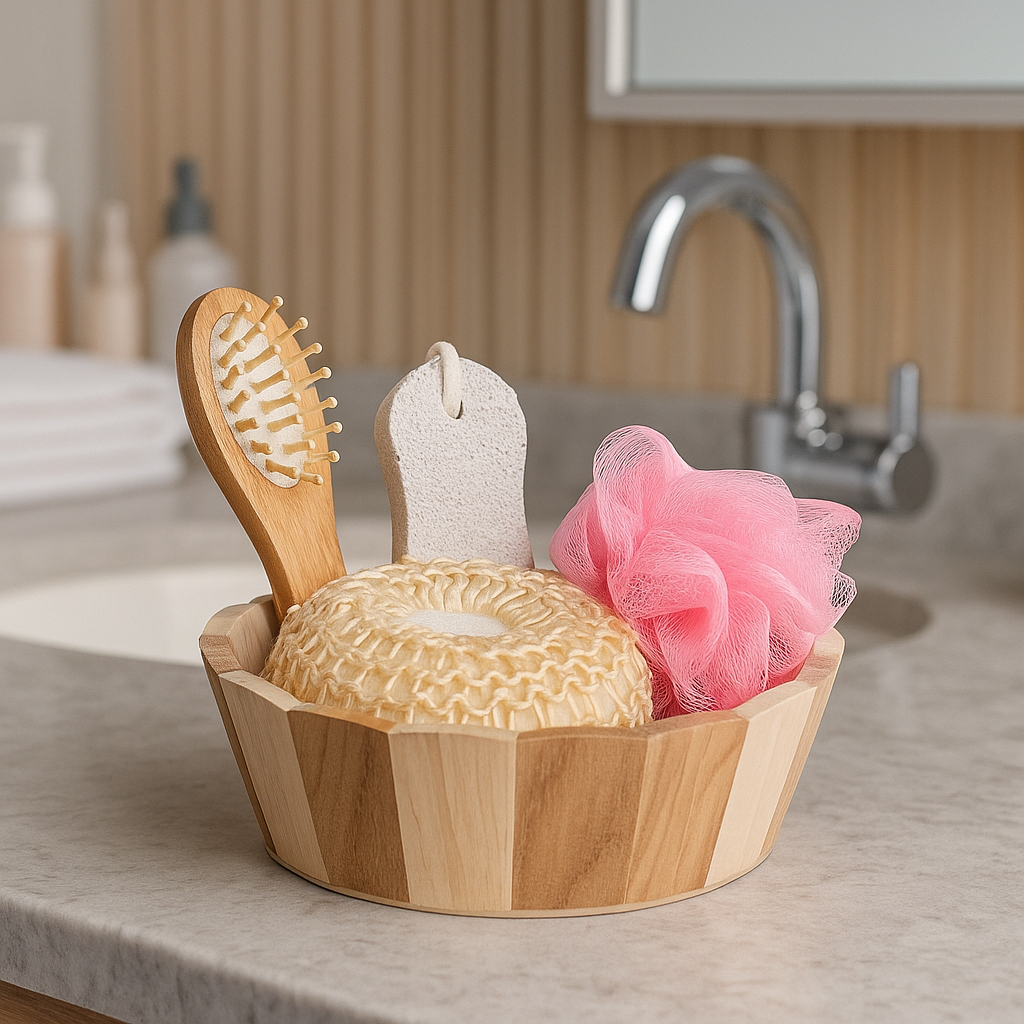 Kit de Banho com Esponja Bucha Lixa e Escova de Madeira Massageadora Presente Decoração Casa Banheiro Spa