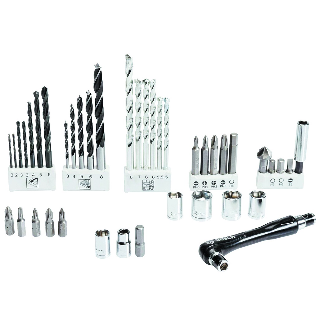 Kit de Pontas e Brocas Bosch V-Line Com 41 Peças Vantagens: - O Kit de Pontas e Brocas V-Line Bosch é um produto completo e ideal para quem busca praticidade para executar diferentes tipos de trabalho. O Kit inclui uma variedade de pontas e brocas, além de diversos acessórios que auxiliam em aplicações de parafusamento, perfuração e fixação; - O design das Pontas foi desenvolvido para evitar o desgaste da cabeça dos parafusos trazendo maior firmeza durante as aplicações, e possuem o encaixe em formato hexagonal que evita o deslizamento na ferramenta. São acompanhadas também por um suporte universal magnético que possibilita trocas rápidas e a fixação segura das pontas; - O Kit possui um variado portfólio de brocas com diferentes diâmetros, sendo as de aço rápido para aplicações em metal, brocas com ponta de metal duro para perfurações em alvenaria e brocas de três pontas para aplicações em diferentes tipos de madeira; - Com sua ampla variedade de acessórios, o Kit pode ser utilizado em diversas aplicações desde reparos, instalações e montagens, até pequenos trabalhos em obras, serralherias e marcenarias, além de acompanhar uma maleta robusta que facilita a armazenagem, transporte e acesso de todo o conteúdo de forma bastante organizada. Características: - Acabamento do acessório: Aço; - Tipo de embalagem: Maleta Plástica; - Uso indicado: Metal, madeira e alvenaria; - Para quais ferramentas se aplica: Furadeiras e Parafusadeiras; - Público Alvo: Hobbistas, pequenos reparos, encanadores, eletricistas, construção civil, instaladores, pequenos trabalhos em marcenaria e serralheria. Dados Técnicos: - Garantia: 6 meses; - Dimensões da embalagem (AxLxP): 6,1 x 17,4 x 23,5 cm; - Peso: 0,840 kg. Componentes incluídos na embalagem: - 1 aparafusadora angular; - 7 Brocas para Metal Ø2/2/3/3/4/5/6mm; - 6 Brocas para concreto Ø5/5,5/6/6/7/8mm; - 5 brocas para madeira Ø3/4/5/6/8mm; - 8 Pontas 25mm: 2x PH2, PZ1, PZ2, T20, HEX Ø5/6, S5; - 5 Pontas 50mm: PH0, PH1, PH2, PH3, H6; - 1 suporte de pontas universal; - 6 Soquetes Ø6/8/9/10/11/13mm; - 1 Adaptador universal; - 1 escareador.