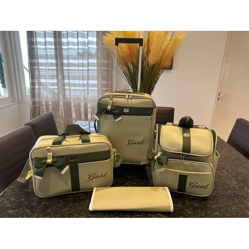 kit de bolsa de maternidade com mala de rodinha e mochila 2 em 1 verde claro com faixa verde escuro