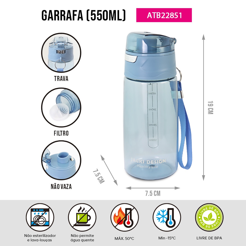 🥗 Kit Bolsa Térmica Completo Jacki Design – Coleção CONCEPT O Kit Completo Jacki Design foi desenvolvido para facilitar sua rotina e incentivar um dia a dia mais saudável e organizado. Composto por bolsa térmica com 2 compartimentos, marmita 950ml, porta talheres, porta escova e garrafa squeeze 550ml, o conjunto é ideal para trabalho, academia, escola ou passeios. Praticidade, segurança e design moderno em um único kit. ---------------------------------------------------------------------------------------------------------------------------------------- 🧊 Bolsa Térmica 2 Compartimentos Produzida em material multicamadas com revestimento interno em folha de alumínio, mantém seus alimentos frescos e bem conservados por mais tempo. ✔ 2 compartimentos separados ✔ Fechamento em zíper ✔ Alça lateral removível ✔ Leve, resistente e fácil de limpar ✔ Design moderno da coleção CONCEPT Medidas: 23 x 14 x 20 cm Peso: 230 g Cuidados: Limpar com pano úmido. Se necessário, usar sabão neutro ou álcool. Secar à sombra. Não deixar de molho e não lavar na máquina. ----------------------------------------------------------------------------------------------------------------------------------------------------------- 🍱 Marmita 950ml Ideal para organizar suas refeições ao longo do dia. ✔ Capacidade de 950ml ✔ Tampa com travas de segurança ✔ Material resistente e livre de BPA ✔ Pode ir ao freezer e lava-louças ✔ Uso em micro-ondas (retirar a tampa antes de aquecer) Temperatura de uso: -20°C a 120°C Material: Tampa em AS | Base em PP Medidas: 19 x 12,7 x 9,4 cm Peso: 210 g -------------------------------------------------------------------------------------------------------------------------------------------- 🍴 Porta Talheres Portátil Essencial para transportar seus talheres com higiene e organização. ✔ Compacto e leve ✔ Fácil de limpar ✔ Material resistente em polipropileno Medidas: 25 x 6 x 3 cm Peso: 62 g ----------------------------------------------------------------------------------------------------------------------------------------------- 🪥 Porta Escova e Pasta de Dente Protege seus itens de higiene e ajuda a preservar a vida útil da escova. ✔ Ideal para escova, pasta e pequenos itens ✔ Material resistente ✔ Prático para viagens e rotina diária Medidas: 7 x 7 x 20,5 cm Material: Polipropileno --------------------------------------------------------------------------------------------------------------------------- 💧 Garrafa Squeeze 550ml com Infusor Perfeita para água, sucos ou chá. ✔ Capacidade 550ml ✔ Filtro infusor interno ✔ Trava de segurança ✔ Alça para transporte ✔ Leve e prática Temperatura de uso: -15°C a 50°C Não vai ao micro-ondas ou lava-louças. Material: Tampa em AS | Garrafa em PETG Medidas: 7,5 x 7,5 x 19 cm -------------------------------------------------------------------------------------------------------------------------- 🌟 Benefícios do Kit ✔ Organização completa para alimentação e higiene ✔ Ideal para rotina saudável ✔ Fácil transporte ✔ Materiais resistentes e duráveis ✔ Design moderno e coordenado