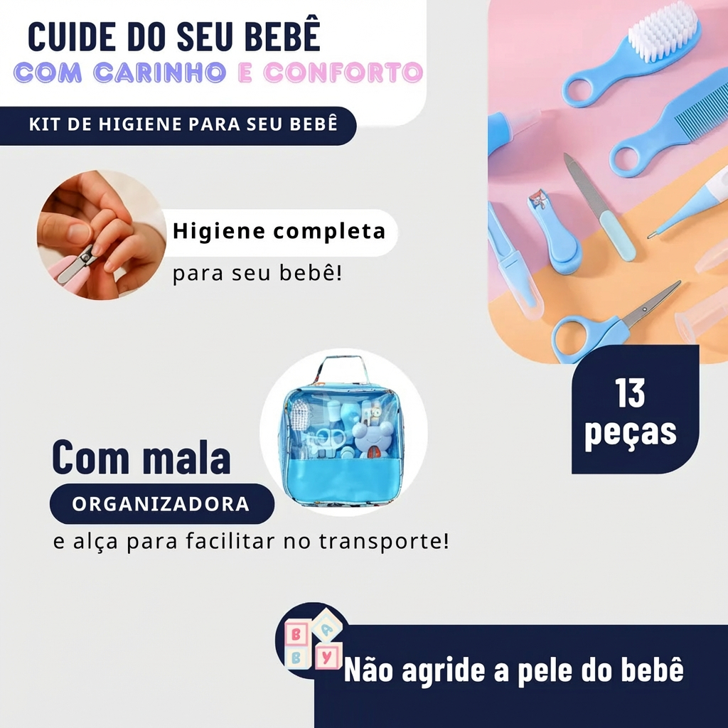 Kit Higiene e Cuidados do Bebê Completo 13 Peças + Bolsa Garanta todo o cuidado e a segurança que o seu bebê merece desde os primeiros dias de vida. Este kit higiene bebê completo com 13 peças essenciais foi desenvolvido para tornar a rotina dos pais muito mais prática, organizada e tranquila, seja em casa ou em viagens. Principais Benefícios Segurança garantida: peças livres de BPA, seguras e adequadas para uso infantil Praticidade no dia a dia: todos os itens em um único kit compacto e completo Organização total: acompanha necessaire para armazenar e transportar com facilidade Presente ideal: opção perfeita para chá de bebê, maternidade ou recém-nascidos O que acompanha o kit (13 peças + bolsa necessaire) 1 Bolsa Nécessaire Organizadora 1 Cortador de Unhas 1 Tesoura sem ponta arredondada 1 Espátula/Lixa de Unhas 1 Pente 1 Escova com cerdas macias 1 Aspirador Nasal anatômico 1 Pinça plástica de segurança 1 Escovinha de dedo para gengiva 1 Colher dosadora para medicamentos 1 Conta-gotas 1 Termômetro Digital (bateria inclusa) 1 Termômetro Sapo para banheira Informações adicionais Indicado para: bebês recém-nascidos e primeiros anos de vida Materiais: plástico, silicone, aço inox (em algumas peças) Peso aproximado: 350g Dimensões da bolsa: 20 x 15 x 5 cm Garantia do vendedor: 30 dias