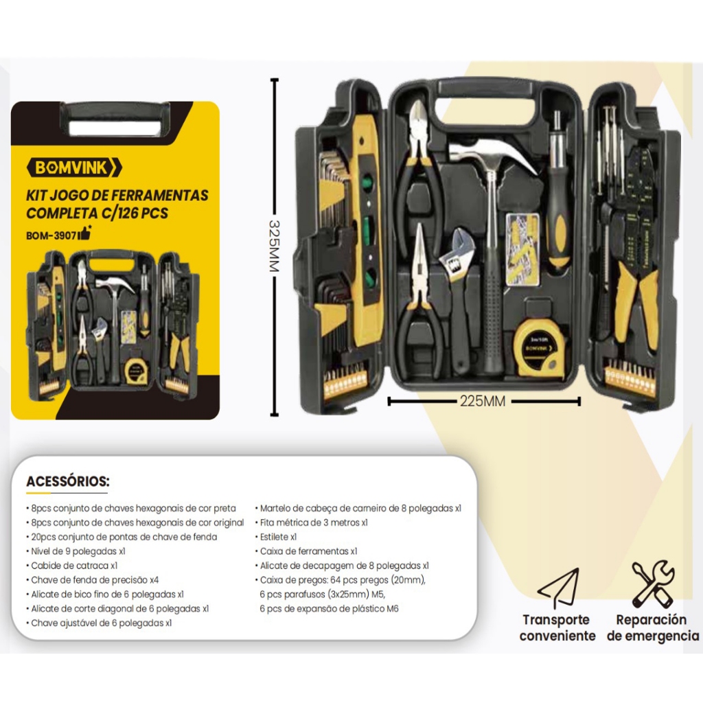 KIT DE FERRAMENTAS C/ 129 PCS TRAVEL MAX UT6129PTDESCRIÇÃO DO PRODUTO:Este Jogo de Ferramentas, adequado para uso doméstico, escritório e oficinas, conta com uma vasta variedade de ferramentas que vão facilitar a sua vida. Tendo sua grande maioria feitas de aço, as peças são resistentes e garantem o sucesso no trabalho realizado.Funcionalidade: Para reparos e manutenção em geralRecursos: Adequado para casa, escritório ou outro local, de fácil e rápido acesso ITENS INCLUSOS: • 8pcs conjunto de chaves hexagonais de cor preta • 8pcs conjunto de chaves hexagonais de cor original • 20pcs conjunto de pontas de chave de fenda • Nivel de 9 polegadas x1 • Cabide de catraca x1 • Chave de fenda de precisão x4 • Alicate de bico fino de 6 polegadas x1 • Alicate de corte diagonal de 6 polegadas x1 • Chave ajustável de 6 polegadas x1 • Martelo de cabeça de carneiro de 8 polegadas x1 • Fita métrica de 3 metros x1 • Estilete x1 • Caixa de ferramentas x1 • Alicate de decapagem de 8 polegadas x1 • Caixa de pregos: 64 pcs pregos (20mm), • 6 pcs parafusos (3x25mm) M5, • 6 pcs de expansão de plástico M6 Peso da embalagem:2100g Tamanho da embalagem:32*24*6.5cm TERMOS DE COMPRA: 1 - Entrega via Shopee por transportadora. 2 - Prazo de Postagem é de até 48 horas, validos apenas para dias úteis após a compra. 3 - O prazo de entrega informado no ato da compra é apenas um prazo estimado e não leva em consideração o prazo de postagem (item 2), podendo haver atrasos por parte da transportadora.O prazo de entrega informado é feito pela Transportadora da Shopee e não por nós. Faça o acompanhamento da sua compra para se certificar que nós postamos o seu produto no prazo informado no item 2. 4 - Todas as imagens são meramente ilustrativas; 5 - Caso o endereço esteja incorreto, o produto irá voltar 6 - É importante que se for necessário escolher alguma variação, escolha o Tamanho/ Modelo / Cor / Voltagem imediatamente 7 - Nossos produtos são originais e acompanham nota fiscalGarantia de 3 meses pelo fabricanteImagens meramente ilustrativas !