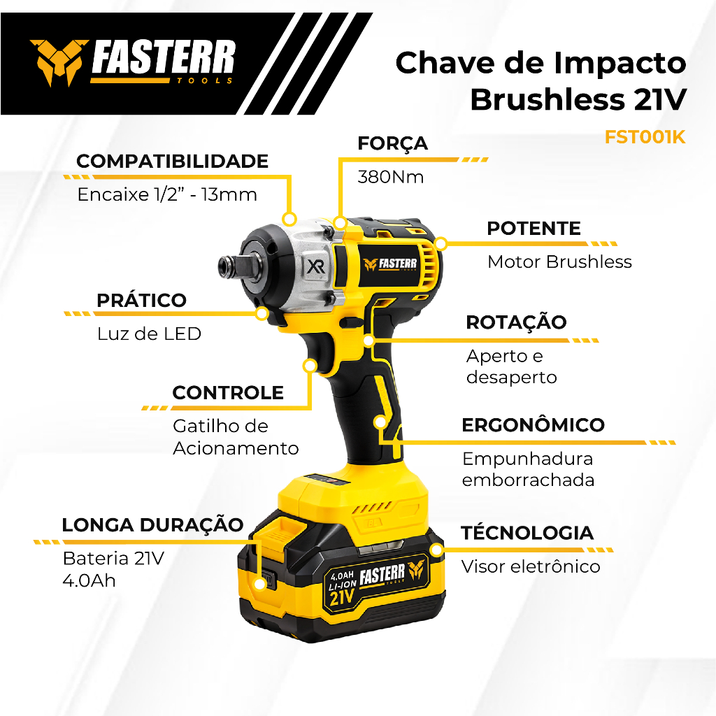KIT FERRAMENTAS 4 EM 1 COM 2 BATERIAS 21V FASTERR - FST001K ✅ Tipos de trabalho onde ele serve muito bem Montagem e manutenção industrial ou pesada: a chave de impacto, permite apertar/desapertar parafusos/porcas grandes, montagem de estruturas metálicas, manutenção de máquinas. Construção civil e reformas: o martelete rompedor permite perfuração com impacto, demolição leve de concreto ou alvenaria, instalação de buchas, suporte de tubulações, etc. Serralheria, metalurgia ou trabalho com metal: a esmerilhadeira angular serve para desbaste, corte de chapas, limpeza de soldas, acabamento em metal. Marcenaria ou montagem de móveis/instalações: a furadeira/parafusadeira com níveis variados de torque permite instalar parafusos, fixações em madeira, fibras, chapas. DESCRIÇÃO DO PRODUTO Eleve sua produtividade e alcance resultados superiores com o Kit 4 Ferramentas Brushless 21V FST001K da Fasterr. Projetado para profissionais que não abrem mão de desempenho, durabilidade e versatilidade, este kit combina a mais avançada tecnologia brushless com um conjunto completo para as mais diversas aplicações. Trabalhe com mais eficiência, menos manutenção e o poder de uma plataforma de baterias intercambiáveis. CARACTERÍSTICAS - Tecnologia Brushless - Alto Desempenho - Baterias Intercambiáveis 21V 4.0Ah - Controle de Velocidade Eletrônico - Kit Completo e Organizado DADOS TÉCNICOS * CHAVE DE IMPACTO XR - Motor: Brushless - Potência: 230W - Torque: 380 Nm - Velocidade Nominal: 1700 RPM - Mandril de Encaixe: 1/2" - 13mm - Controle de Velocidade: Eletrônico - Rotação Reversível: Sim - Soquete extra: 22mm *MARTELETE ROMPEDOR/ PERFURADOR: - Motor: Brushless - Potência: 310W - Velocidade Nominal: 1200 RPM - Mandril de Encaixe: SDS-PLUS - Controle de Velocidade: Eletrônico - Impactos por Minuto: 3.500 IPM - Função Vario-Lock: Sim *ESMERILHADEIRA ANGULAR: - Motor: Brushless - Potência: 400W - Rosca do Eixo: M14 - Velocidade Nominal: 7.200 RPM - Diâmetro do disco: 115mm - Controle de Velocidade: 4 opções FURADEIRA PARAFUSADEIRA: - Motor: Brushless - Potência: 240W - Torque: 35 Nm - Níveis de Torque: 21 - Velocidade Nominal: 1.500 RPM - Mandril de Encaixe Rápido: 3/8" - 10mm - Material do Mandril: Metal - Controle de velocidade: Sim - Função Impacto: Não INSTRUÇÕES DE USO - Antes de utilizar as ferramentas, verifique se as baterias estão completamente carregadas. - Conecte o carregador bivolt à bateria de 21V e à tomada elétrica. O indicador de carga, caso presente, mostrará o progresso do carregamento. - Após a carga completa, desconecte o carregador e insira as baterias nas ferramentas. - Para usar qualquer ferramenta do kit (furadeira de impacto, chave de impacto, martelete e esmerilhadeira), insira o acessório apropriado para o tipo de trabalho que deseja realizar. USO - Para trocar acessórios, use a chave de aperto incluída no kit, quando necessário, e desligue a ferramenta para evitar acidentes. - Equipamentos de Proteção Individual (EPIs): Sempre utilize óculos de segurança, luvas e protetor auricular quando estiver operando as ferramentas. ITENS INCLUSOS (1) Chave de Impacto XR (1) Esmerilhadeira Angular (1) Furadeira Parafusadeira (1) Martelete Rotativo Rompedor (1) Bit Fenda/Phillips (1) Chave de aperto do disco (1) Capa protetora do disco (1) Soquete 22mmm (2) Empunhadura Auxiliar (Mart./Esmeril.) (1) Alça de Transporte (1) Limitador de profundidade (2) Bateria de Lithium-Ion 21V 4.0Ah (1) Carregador Bivolt (1) Maleta de Transporte MARCA: Fasterr Tools MODELO: Fasterr - FST050 - Importante: Antes de usar, leia atentamente o manual de instruções da ferramenta. *A DD Máquinas é distribuidora exclusiva FASTERR. TERMOS DE COMPRA 1 - Entrega via Shopee por transportadora. 2 - Prazo de Postagem é de até 24hs, validos apenas para dias úteis após a compra. 3 - O prazo de entrega informado no ato da compra é apenas um prazo estimado e não leva em consideração o prazo de postagem (item 2), podendo haver atrasos por parte da transportadora. O prazo de entrega informado é feito pela Transportadora da Shopee e não por nós. Faça o acompanhamento da sua compra para se certificar que nós postamos o seu produto no prazo informado no item 2. 4 - Todas as imagens são meramente ilustrativas; 5 - Caso o endereço esteja incorreto, o produto irá voltar e o pagamento será devolvido. 6 - É importante que se for necessário escolher alguma variação, escolha o Tamanho/ Modelo / Cor / Voltagem imediatamente 7 - Nossos produtos são originais e acompanham nota fiscal Garantia de 90 dias pelo fabricante Imagens meramente ilustrativas