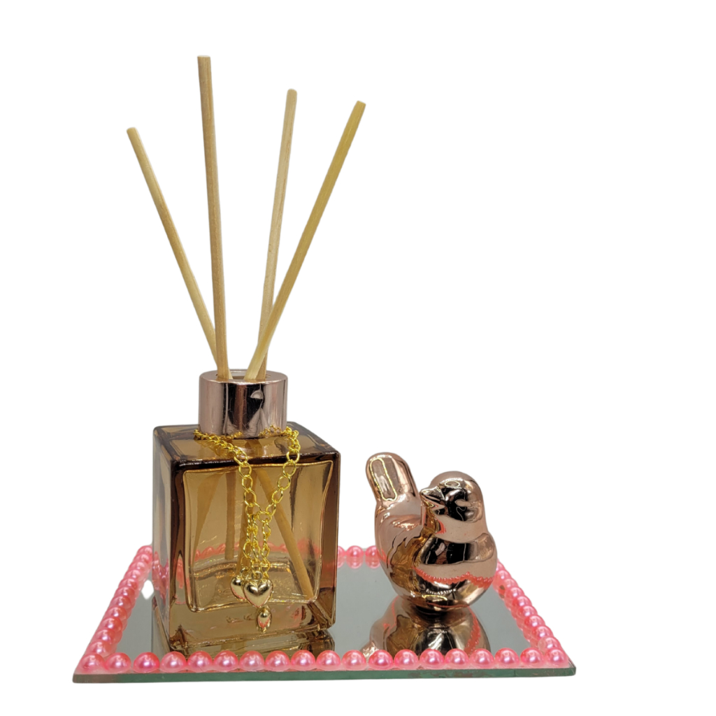 DESCRIÇÃO 01- FRASCO CUBO DE 100 ML AMBAR 01- TAMPA DIFUSORA 01- ENFEITE PARA O FRASCO 01- PASSARINHO DE CERAMICA METALIZADO Transforme o ambiente da sua casa com o nosso Kit para Difusor de Aroma. Com uma bandeja decorada e adoráveis passarinho em diferentes acabamentos, este kit combina funcionalidade e estilo. Ideal para quem busca um toque de elegância na decoração, enquanto proporciona uma fragrância envolvente e relaxante. Perfeito para qualquer cômodo, deixe o seu espaço ainda mais acolhedor.