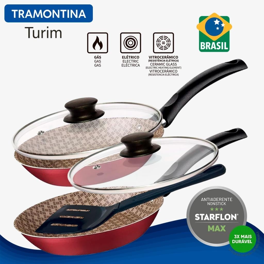 Descrição: Vai preparar aquele bife suculento ou legumes salteados para seu almoço? Então, conte com o jogo de frigideiras com tampa Tramontina Turim em alumínio com revestimento interno e externo em antiaderente Starflon Max vermelho 24 centímetros de diâmetro 1,4 litros. Com elas, você prepara suas refeições de maneira mais rápida e uniforme, sem que eles grudem em sua superfície, pois a produção delas são inteiras em alumínio com revestimento antiaderente Starflon Max. As frigideiras ainda são muito fáceis de limpar, podem ir à máquina de lavar louças e tem cabos em baquelite antitérmico que garante maior segurança ao manuseio! Características: - Corpo de alumínio com espessura de 1,2 mm que proporciona cozimento rápido e uniforme. - Revestimento interno e externo de antiaderente Starflon Max que não gruda, é fácil de limpar, mais durável e não é prejudicial à saúde, pois é livre de PFOA. - Cabo de baquelite antitérmico que oferece segurança durante o manuseio. - Pode ir à máquina de lavar louças facilitando seu dia a dia. - Pode ser utilizada nos fogões: gás, elétrico e vitrocerâmico - resistência elétrica. Orientações de Uso: - A capacidade volumétrica máxima para cozimento é de 3/4 da capacidade total da peça. - Em fogões com grade, centralize a peça e alinhe as alças com a grade. - Centralize seu utensílio com a chama ou fonte de calor. - Utensílios quentes devem estar fora do alcance das crianças. - Antes do primeiro uso, lave com esponja macia, sabão neutro ou detergente líquido. - Depois de secar, unte a área interna com óleo ou gordura e leve ao fogo por um ou dois minutos. Deixe esfriar e lave novamente. - Seu utensílio Starflon está pronto para uso com ou sem gordura, sempre em fogo baixo ou médio (nunca superior a 260 °C). - Para mexer os alimentos use somente utensílios de silicone, nylon ou madeira. - Com o uso, o pegador pode afrouxar devido à dilatação normal dos materiais. Reaperte apenas o suficiente, sem forçar. - Limpeza: Evite a imersão do utensílio quente em água fria. - Nunca utilize produtos abrasivos na lavagem. - Se deixar queimar alimentos, umedeça a área e reserve até que possa remover os resíduos grudados com esponja e sabão. - Para descarte do produto e embalagem siga as orientações de reciclagem vigentes. Ficha Técnica: Marca: Tramontina Produto: Jogo de Frigideiras com Tampa com Espátula Linha Comercial: Turim Cód Fabricante: 20255824 Material: Alumínio - Baquelite - Vidro Temperado Revestimento: Antiaderente Starflon Max Cor: Vermelho Diâmetro: 24cm Tipos de Fogão: Gás - Elétrico - Vitrocerâmico Espessura: 1,2mm Nº de Peças: 2 Peças Dimensão do Produto: 416x250x98 mm Espessura: 1,2mm Peso: 500g Itens Adicionais: Mais Utensílio Espátula para Cozinha em Nylon ( Utensílio não pertence à marca Tramontina ) - Material: Nylon - suporta até 190ºC. - Cores: Preto. - Medidas Aprox.(cada): Comprimento 29cm - Itens: Espátula - As Tampas adicionadas ao KIT não pertence à marca Tramontina, sendo em vidro temperado com orifício de respiro e de marca conforme a disponibilidade em estoque. Conteúdo: - 02 Frigideiras 24cm Tramontina Turim em Alumínio Antiaderente Vermelha - 02 Tampas de Vidro Temperado com Saída para Vapor ( Não pertence à marca Tramontina) - 01 Utensílio Espátula em Nylon ( Utensílio não pertence à marca Tramontina )