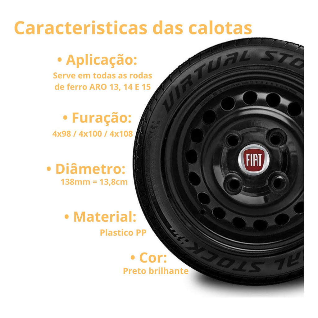 Realce o Estilo do seu Veículo com as Calotas de Centro de Rodas Fiat! Dê uma aparência renovada ao seu carro com as calotas de centro de roda Fiat, uma escolha de estilo moderno e elegante, trazendo um efeito esportivo ao veículo. Estas calotas não apenas melhoram a estética do seu carro, mas também oferecem funcionalidade e proteção para as rodas. Compativel: - Toda Linha Fiat Com Rodas De Ferro. Características Principais: - Construção Durável: Feitas de materiais resistentes para resistir a condições variadas. - Montagem Sem Arruelas: Instalação simples e rápida, sem a necessidade de arruelas adicionais. - Proteção Adicional: Protege as rodas contra sujeira, poeira e pequenos danos. - Modelo universal: Serve em TODAS as rodas de ferro aro 13, 14 e 15 que tenha 4 furos, independente da montadora. Especificações Técnicas: - Furação: 4x98 / 4x100 / 4x108 - Diâmetro: 138mm = 13,8cm - Cor: Preto Brilhante (Não é pintura e não descasca) - Material: Plástico PP Injetado - Fixação: Através dos parafusos da própria roda do veículo - Incluso: 4 calotas e 4 emblemas adesivos da montadora Importante: - Valor do anúncio referente ao jogo de 4 calotas + 4 emblemas da montadora fiat. - Acompanha Nota Fiscal. - Envio imediato. - Garantia de 3 meses contra defeitos de fabricação no produto. Conte com a gente, pergunte, tire duvidas e vamos pra cima! Entrega rápida, no mesmo dia, produto em estoque! Atenciosamente Equipe MERCADO WEB! Garantia do vendedor: 90 dias