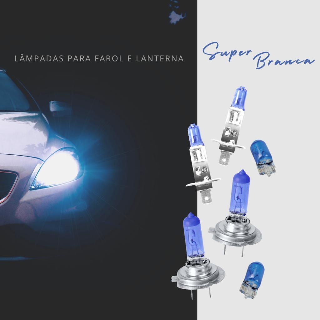 O efeito estético causado com as lâmpadas super brancas de 8500k vão te surpreender. ** QUALQUER DÚVIDA REFERENTE A APLICAÇÃO CORRETA DO COMPONENTE, NOS CHAME! ** KIT DE LÂMPADAS PARA FAROL SUPER BRANCAS - 1 par de lâmpadas super brancas H7 para farol (para faróis que possuem dois terminais/casquilhos) - 1 par de lâmpadas super brancas H1 para farol (para faróis que possuem dois terminais/casquilhos) - 1 par de lâmpadas pingão W5W T10 super branca para a luz de lanterna de seu carro. As lâmpadas super brancas aumentam a Iluminação do farol de seu carro e dão um ótimo efeito estético com sua iluminação mais branca que as lâmpadas originais, proporcionando também maior segurança ao dirigir a noite. A fabricação da lâmpada super branca é feita com vidro em quartzo que aumenta a resistência térmica e dá maior durabilidade e vida útil para a lâmpada. Tecnologia super branca, luz mais branca e maior facho de luz, bulbo de vidro na cor azul para melhor aparência. Atenção: H7/H1 é o tipo de encaixe que a lâmpada tem no farol, ou seja, o modelo do plug, confirme o modelo de lâmpada de seu carro caso não tenha certeza! *A embalagem está sujeita a alterações conforme a disponibilidade do fornecedor. FICHA TÉCNICA: MODELO: H7 8500K POTÊNCIA: 55W ALIMENTAÇÃO: 12V TECNOLOGÍA: HALÓGENA SUPER BRANCA ENCAIXE: H7 BASE: PX26d CONEXÃO: 2 PINOS PROTEÇÃO UV: SIM SELO INMETRO: SIM MODELO: H1 8500K POTÊNCIA: 55W ALIMENTAÇÃO: 12V TECNOLOGÍA: HALÓGENA SUPER BRANCA ENCAIXE: H1 BASE: P14.5S PROTEÇÃO UV: SIM SELO INMETRO: SIM MODELO: LÂMPADA T10 12V W2,1 X 9,5D PINGÃO AZUL POTÊNCIA: 5W ENCAIXE: W5W ALIMENTAÇÃO: 12V BASE: W2,1 x 9,5d PROTEÇÃO UV: SIM SELO INMETRO: SIM TECNOLOGÍA: HALÓGENA SUPER BRANCA