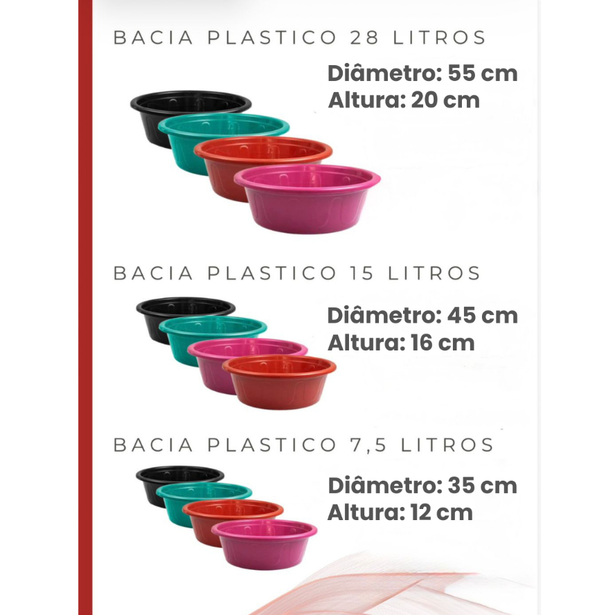 🔥 KIT DE LAVANDERIA COM 3 BACIAS E 1 BALDE MULTIUSO🔥 💡 Esse é o kit perfeito para você que necessita de praticidade em sua rotina, seja na lavanderia, cozinha ou jardim ✔ Design moderno nas cores preto, vermelho, verde claro e rosa ⚫️🔴🟢🟣 ✔ Super prática, durável e resistente fabricada com plástico de qualidade 💪 ✔ Bacias e Balde espaçosos, confira abaixo as medidas: 📏 - Bacia Grande: 28 Litros - Bacia Média: 15 Litros - Bacia Pequena: 7,5 Litros - Balde: 5,5 Litros ✅ Ótima escolha para seu lar ou comércio, esse kit completo oferece qualidade e preço justo que você merece ! 🚨Aproveite nosso mega desconto por tempo limitado ou até durarem nossos estoques 🚨