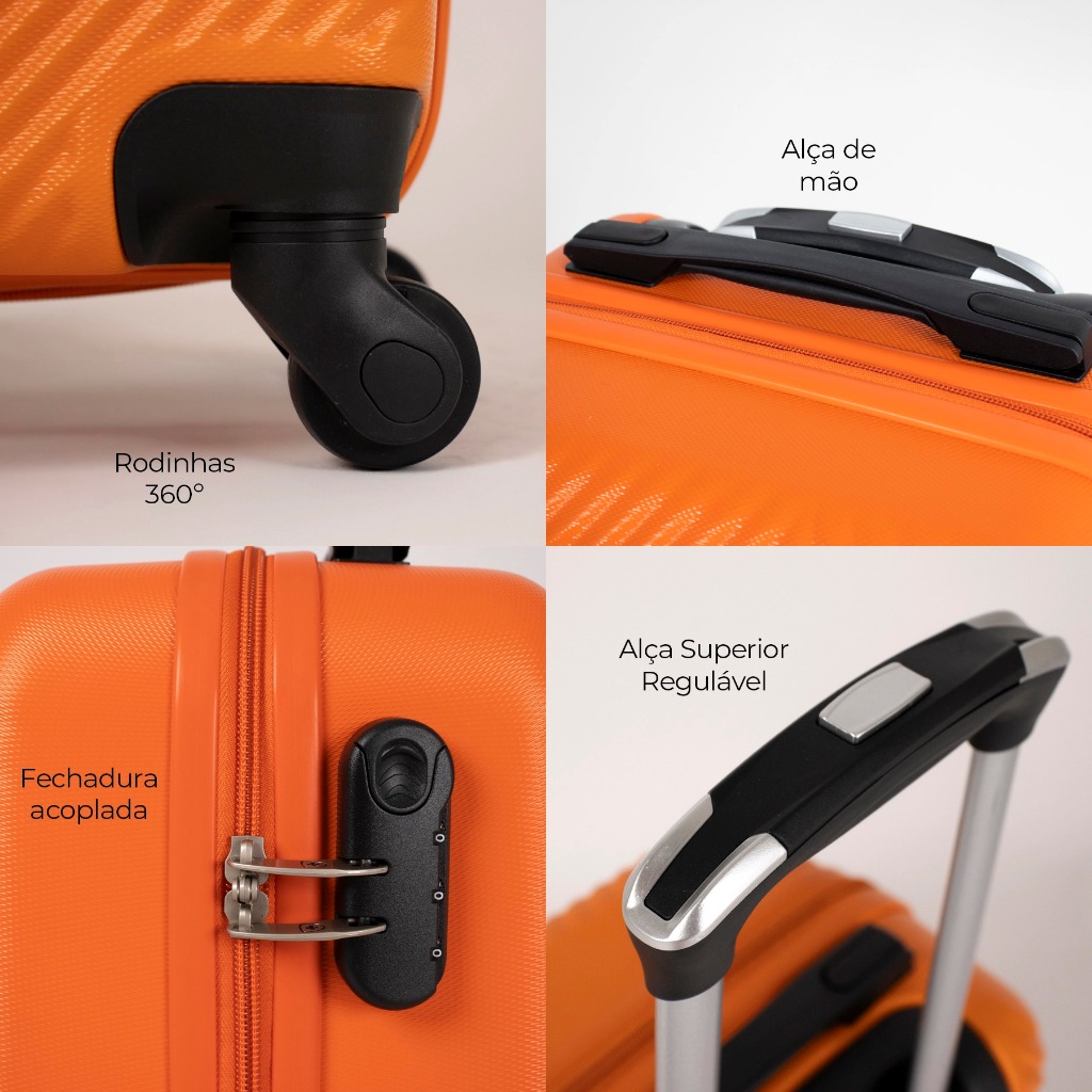 Com o kit de mala de viagem pequena e média Laranja Zug Swiss Move, você fica preparado para qualquer ocasião, estadia, temperatura e destino. Isso porque, essa linha é super versátil e atende bem às necessidades do usuário. Produzidas em ABS, um material forte e resistente, esse modelo contém carrinho embutido com 4 rodas giratórias em 360, alça superior no tamanho pequeno e alça lateral na mala de tamanho médio, além da superior que facilita o transporte e a fechadura dessas malas de viagem é por zíper. No interior as malas de viagem são forradas em poliéster, contêm cintas elásticas cruzada com travas, divisórias com zíper e bolsos telados, ou seja, possuem muito espaço para você levar seus objetos com segurança e organização. Ah, a mala de viagem pequena desse conjunto atende as medidas necessárias para ir a bordo com você na cabine do avião, com medida de 53x32x20 cm. Já a mala de viagem média é para despachar, tem a medida de 65x42x26 cm. Além disso, a linha Zug é divertida e inigualável, pois conta com um design exclusivo e cores vibrantes. Comprando agora mesmo você garante 3 meses de garantia pelo fabricante.