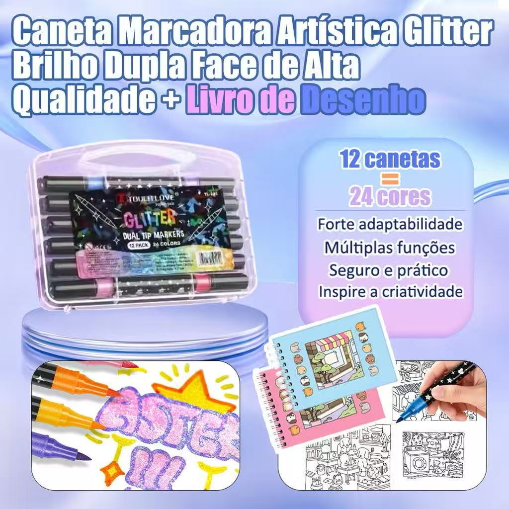 Kit de Marcadores metálicos Ponta Dupla glitter com Livro colorir capa dura 50 folhas