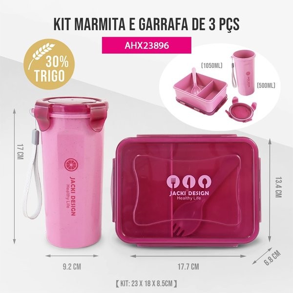Kit Marmita + Garrafa ELEMENTOS – Praticidade para sua Rotina Saudável Jacki Design O Kit Marmita e Garrafa da Coleção ELEMENTOS foi desenvolvido para quem busca praticidade, organização e mais autonomia na alimentação diária. Ideal para trabalho, escola, academia ou passeios, ele permite transportar refeições e bebidas com segurança e eficiência. Produzido com 30% de fibra de trigo e livre de BPA, o kit combina resistência, leveza e qualidade, garantindo mais segurança para o uso diário. 🍱 Marmita – 1050 ml Com capacidade ideal para refeições completas, a marmita é prática e funcional, facilitando a organização dos alimentos ao longo do dia. Diferenciais: ✔ Capacidade de 1050 ml ✔ Produzida com 30% de fibra de trigo ✔ Livre de BPA ✔ Leve, resistente e durável ✔ Ideal para refeições equilibradas fora de casa 🥤 Garrafa com Tampa – 500 ml Perfeita para manter sua hidratação em dia, a garrafa de 500 ml é prática e fácil de transportar. Produzida no mesmo material resistente com fibra de trigo, oferece leveza e segurança para o uso diário. Diferenciais: ✔ Capacidade de 500 ml ✔ Composição com 30% de fibra de trigo ✔ Livre de BPA ✔ Leve e funcional 📏 Medidas do Kit 23 cm (C) x 18 cm (L) x 8,5 cm (A) 📌 Instruções de Uso (Marmita) Retirar a tampa antes de levar ao micro-ondas Utilizar apenas para aquecer (não cozinhar) Temperatura suportada: -20°C a 120°C Lavar com esponja macia e detergente neutro ⭐ Por que escolher o Kit ELEMENTOS? • Ideal para uma rotina mais organizada e saudável • Transporte prático de refeições e bebidas • Materiais resistentes e livres de BPA • Composição com fibra de trigo • Qualidade e design funcional Jacki Design O Kit ELEMENTOS Jacki Design é a escolha ideal para quem deseja unir praticidade, sustentabilidade e eficiência no dia a dia.