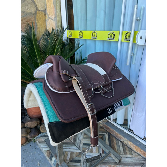 Kit de Montaria Sela Freio de Ouro Travessão Chinchador Barrigueira Loro e Estribo Inox e Manta EVA