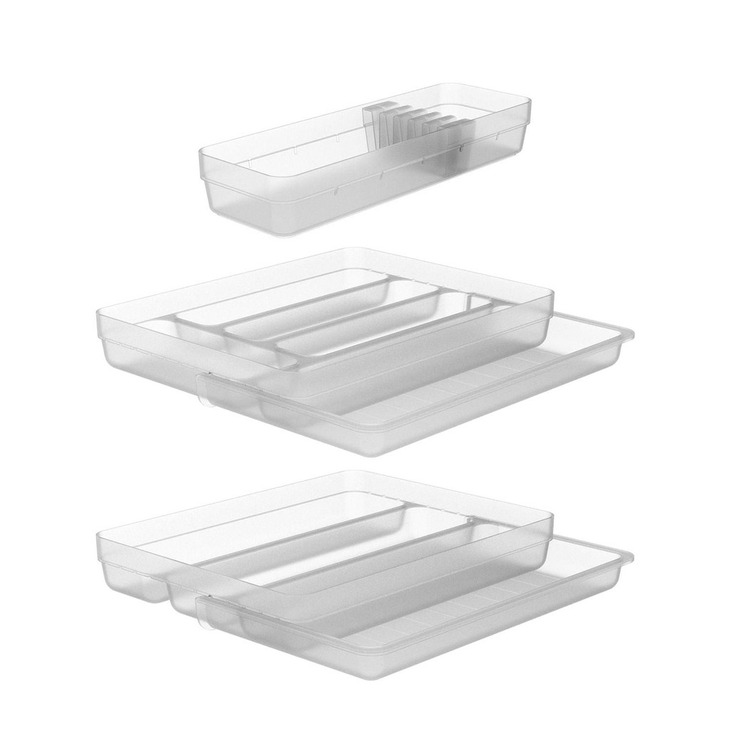 O Conjunto Organizador De Talheres, Facas e Utensílios 3 Peças é perfeito para organizar suas gavetas de talheres. Com 5 segmentações, o produto permite segmentar os talheres de forma visual, simples e prática, mantendo-os limpos e protegidos. A linha traz diferentes tamanhos e cores que são fáceis de combinar e possuem modularidade entre si permitindo diferentes soluções para organização conforme sua necessidade e criatividade. Os produtos são fabricados em material texturizado (Polipropileno) diminuindo a aparecimento de riscos e aranhões. Além de possuir cantos arredondados que não acumulam sujeira e facilitam a higienização. Guarde, segmente, organize seus talheres conforme a sua criatividade, a linha Logic vem para auxiliar na organização da sua cozinha, através de acessórios que trazem funcionalidade e cuidado com o seu dia a dia. INFORMAÇÕES TÉCNICAS Material: PP (polipropileno) Cor: Natural CUIDADOS Sugere-se higienizar com sabão neutro e esponja macia, evitando produtos abrasivos no processo de limpeza. CONTEÚDO DA EMBALAGEM 1 Organizador De Facas Logic 11,5 x 35 x 5,5 cm 1 Organizador De Talheres Com Extensor Logic 28 x 36 x 6 cm 1 Organizador De Utensílios Com Extensor Logic 28 x 36 x 6 cm SOBRE NÓS Somos apaixonados pelo que fazemos e utilizamos o design como meio de fazer você se sentir em casa onde estiver. Criamos produtos com carinho e cuidado para atender as suas necessidades diárias, levando bem-estar, aconchego e conforto para seu lar. Somos minimalistas e funcionais pois queremos que você tenha um estilo de vida mais leve e organizado, para atingir o máximo do seu potencial. Prazer, somos Ou.