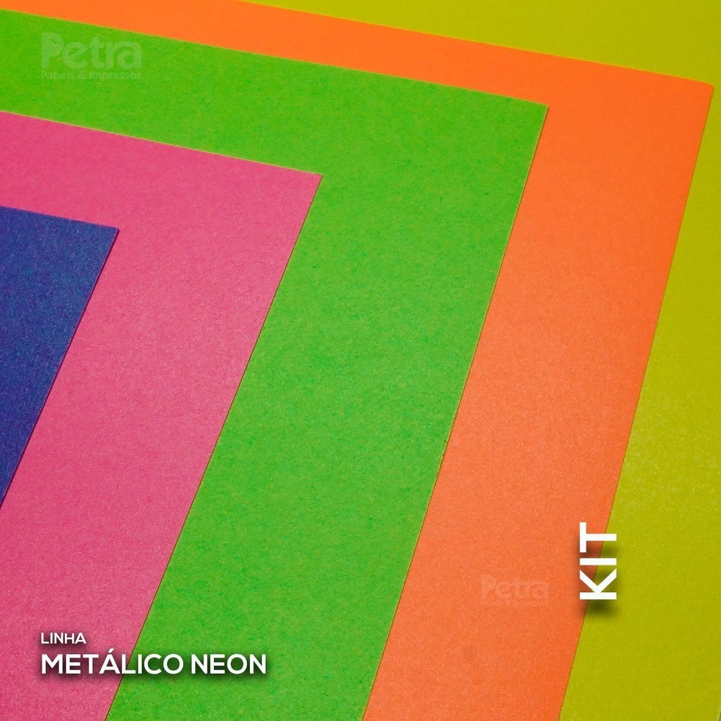 Kit de Papéis Perolados Neon Tamanho: A4 (21x29,7cm) - 180g/m² Quantidade: 50 folhas Nesse kit contém: 10 Metálico Neon - Amarelo10 Metálico Neon - Laranja10 Metálico Neon - Pink10 Metálico Neon - Roxo10 Metálico Neon - Verde Atenção: Não é possível alterar a quantidade do Kit e nem as cores. Papel metalizado com um toque cintilante, vibrante e cores vivas.Ideal para elaboração de convites, lembranças, cardápios, embalagens e outros. Aceita impressão Laser, Offset, SilkScreen, Hotstamping, Relevo Seco, Relevo AmericanoTambém aceita impressão em impressoras Jato de Tinta !