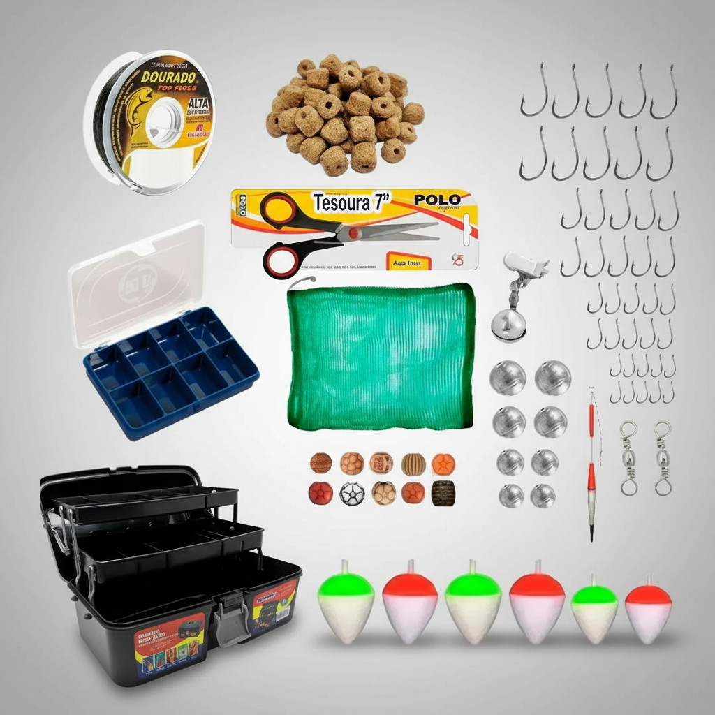 O kit de pesca contem 01 Maleta resistente em polipropileno com alça para transporte. Possuí bandeja basculante. 01 Estojo organizador. Um ótimo organizador para facilitar sua pescaria, podendo armazenar anzois, giradores, miçangas, Anzol 4330 Super Strong Marine Sports Niquelado Nickel, pois possui farpas muito eficiente que auxilia na fisgada do peixe. 10 Anzol 4330 No1 (3,1 cm) 10 Anzol 4330 No6 (2,0 cm) 10 Anzol 4330 No8 (1,8cm) 10 Anzol 4330 No10 (1,5 cm) Chumbo bolinha, utilizado para pesca de fundo. 2 Chumbo de 2gr 2 Chumbo de 6gr 2 Chumbo de 8gr 2 Chumbo de 10gr Boia em isopor colorida, possui um bastão de plastico para a passagem da linha. 2 Boia no3 2 Boia no4 2 Boia no5 2 Giradores simples em aço carbono no7, Utilizado para evitar torção da linha. 1 Sinete/Guizo de Espera utilizado em varas para deixar em espera aguardando o peixe puxar. 1 Pacote com isca furadinha 100 gramasdiversos tipos de peixes como Tambas, Tilápia, Matrinxãs, Carpas e outros. 1 Tesoura para Cortador a linhas, iscas e outros 100m de Linha 0,250mm, monofilamento em nylon 1 Viveiro/Samburá para guardar seus peixes. Em nylon, tela de mosquiteiro. 1 Boia Peninha Palito Madeira 15cm 10 Missanga colorida