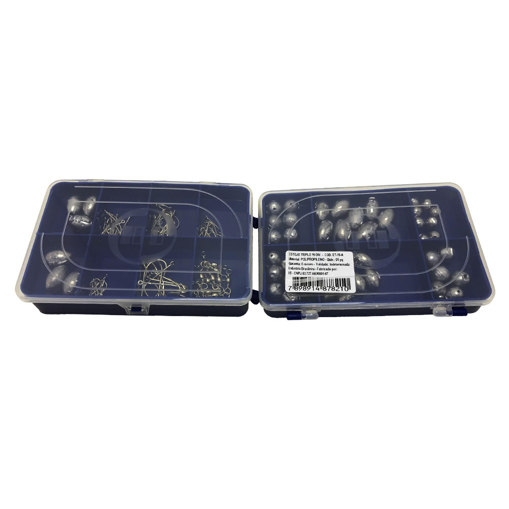 1 Estojo Para Pesca Triplo 14X10X5 CM AZUL Anzol 4330 Strong Marine Sports Niquelado Nickel,facilita fixar a isca e também ao fisgar do peixe a ser pescado, pois possui farpas muito eficiente que facilitam a pesca 10 Anzol 4330 Nº1 (3,1 cm) 10 Anzol 4330 Nº4 (2,4 cm) 10 Anzol 4330 Nº6 (2,0 cm) 10 Anzol 4330 Nº8 (1,8cm) 10 Anzol 4330 Nº10 (1,5 cm) Chumbo Bolinha, utilizado em pesca de fundo, fazendo com que a isca permaneça no fundo da água 8 Chumbo Bolinha de 2gr 8 Chumbo Bolinha de 6gr 8 Chumbo Bolinha de 10gr 8 Chumbo Oliva de 8gr 8 Chumbo Oliva de 15gr 10 Giradores simples em aço carbono nº7, super resistente. Utilizado para evitar torção da linha. 2 Sino/Guizo 1 Canivete 1 Linha 0,25mm monofilamento Bóia em isopor colorida, utilizada para controlar a profundidade da isca em rios e pesqueiros, possui um bastão de plástico para a passagem da linha 8pçs Bóia nº3 8pçs Bóia nº4 8pçs Bóia nº5 1 Sapo Frog 11gr 1 Shad de silicone 6cm 1 Isca artificial meia água Imagens Ilustrativas ======================================================================= Nossa empresa atua exclusivamente no comércio de PESCA, CAMPING e LAZER. Trabalhamos com as melhores e mais renomadas marcas do mercado. Confira algumas vantagens de comprar conosco: - Temos CNPJ, somos uma empresa consolidada - Emitimos Nota Fiscal eletrônica - Postamos sua encomenda no mesmo dia ou NO MÁXIMO no próximo dia útil - GARANTIA dos produtos vendidos - Todos os produtos são TESTADOS antes do envio - Produtos a pronta entrega - Atendimento personalizado - Produtos ORIGINIAIS de alta qualidade Nossos horários de atendimento: - SEG A SEX das 9h00 às 18:30hs