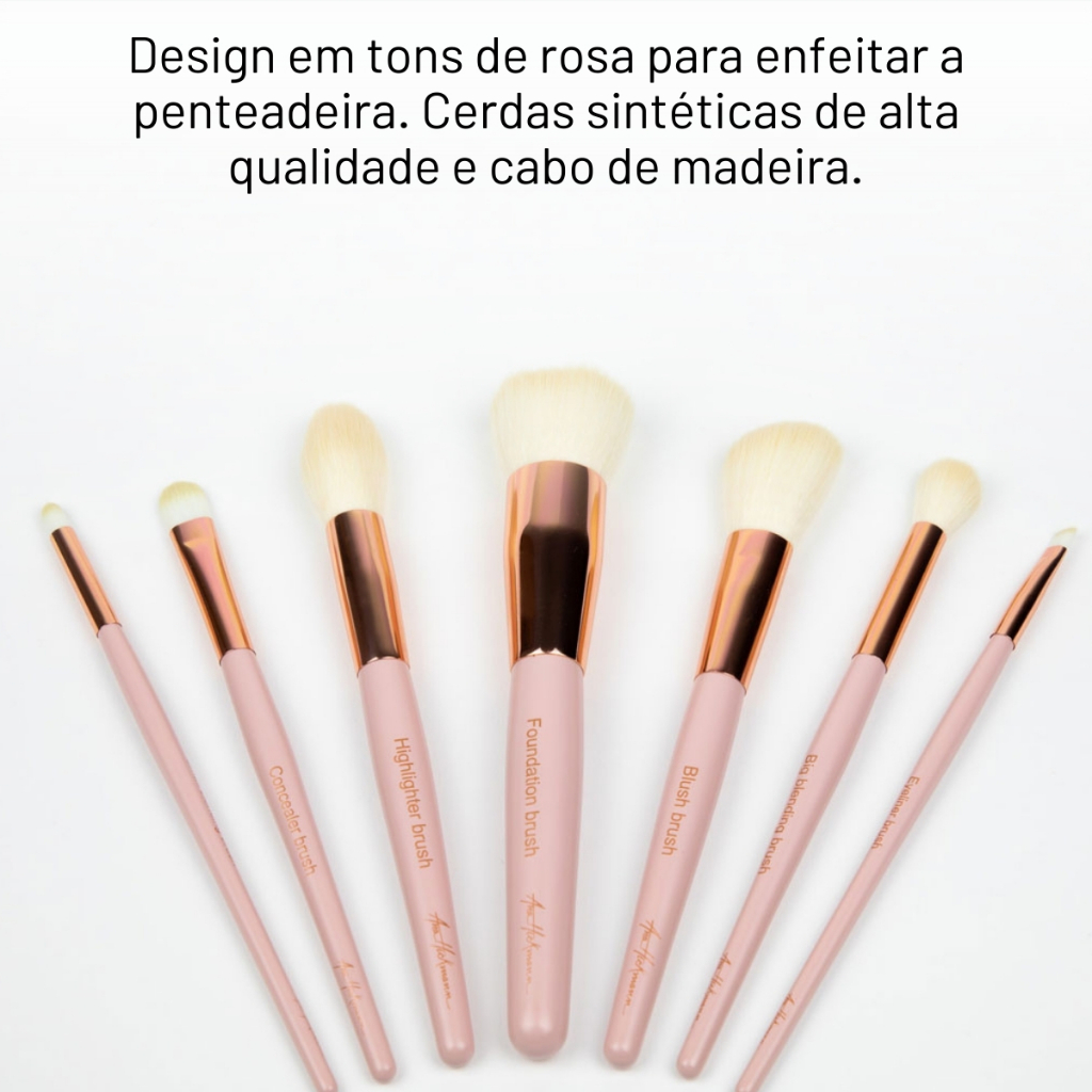 Sinta-se poderosa e confiante com a linha de maquiagens de Ana Hickmann. Produtos para rosto, olhos, boca e acessórios como esponjas, curvex, pincéis profissionais e kits. Produtos de alta performance. Seja a protagonista do seu próprio beauty show! Conjunto de pincéis para olhos e face em tons de rosa para maquiar e enfeitar a penteadeira. Modo de Uso: - Small blending brush: use para esfumar pequenas áreas, como o lápis de olho rente aos cílios - Big Blending Brush: use para aplicar e esfumar sombra - Highlighter Brush: use para aplicar iluminador as têmporas e pontos altos do rosto - Foundation Brush: use para aplicar em todo o rosto - Blush Brush: use para aplicar blush e/ou bronzer - Concealer Brush: use para aplicar corretivo - Eyeliner Brush: use com delineadores em gel ou creme Material: CERDAS DE FIBRAS SINTÉTICAS, ALUMÍNIO, MADEIRA * Produto Vegano *