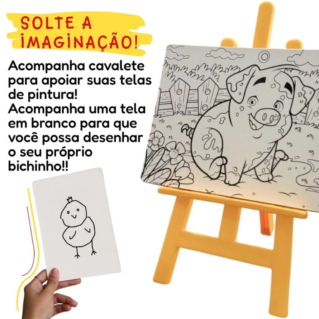 DESCRIÇÃO DO PRODUTO Solte a imaginação dos pequenos artistas com o Kit de Pintura Infantil Pinturinha Fazendinha! Um conjunto completo e superdivertido para a criançada explorar o mundo das cores enquanto cria seus próprios bichinhos da fazenda. O kit acompanha tudo para transformar qualquer cantinho em um verdadeiro ateliê: 1 Cavalete de Plástico – leve, prático e ideal para os pequenos artistas trabalharem como profissionais 4 Telas em MDF – com desenhos temáticos da fazenda + 1 tela branca para criar seu próprio bichinho do zero! Tintas coloridas – cores vibrantes e seguras para soltar a criatividade Diversão e aprendizado garantidos – estimula coordenação motora, criatividade e concentração Perfeito para tardes criativas, festinhas, presentes ou até atividades escolares! Ideal para crianças a partir de 3 anos com supervisão de um adulto. CARACTERÍSTICAS TÉCNICAS: Conteúdo da Embalagem: 01 Cavalete plástico, 04 telas em madeira, 06 tintas guache, 01 pincel Dimensões Aproximadas do Produto: 25 cm (Altura x Largura x Comprimento/Profundidade). Dimensões Aproximadas da Embalagem: 25 cm x 20 cm x 6 cm (Altura x Largura x Comprimento/Profundidade). Material/Composição: Madeira MDF, peças em polipropileno, tinta pigmentada e conservantes Idade Mínima Recomendada: A partir de 4 anos Participantes: A partir de 1 pessoa Alimentação: Não se aplica Marca: Nig Brinquedos Referência: 0244 Outras informações: As cores podem variar entre as imagens mostradas acima e o produto. Imagens meramente ilustrativas. Aviso: As informações e imagens divulgadas são de total responsabilidade do fabricante/fornecedor. Produto lacrado e disponível a pronta entrega para todo Brasil! APROVADO PELO INMETRO