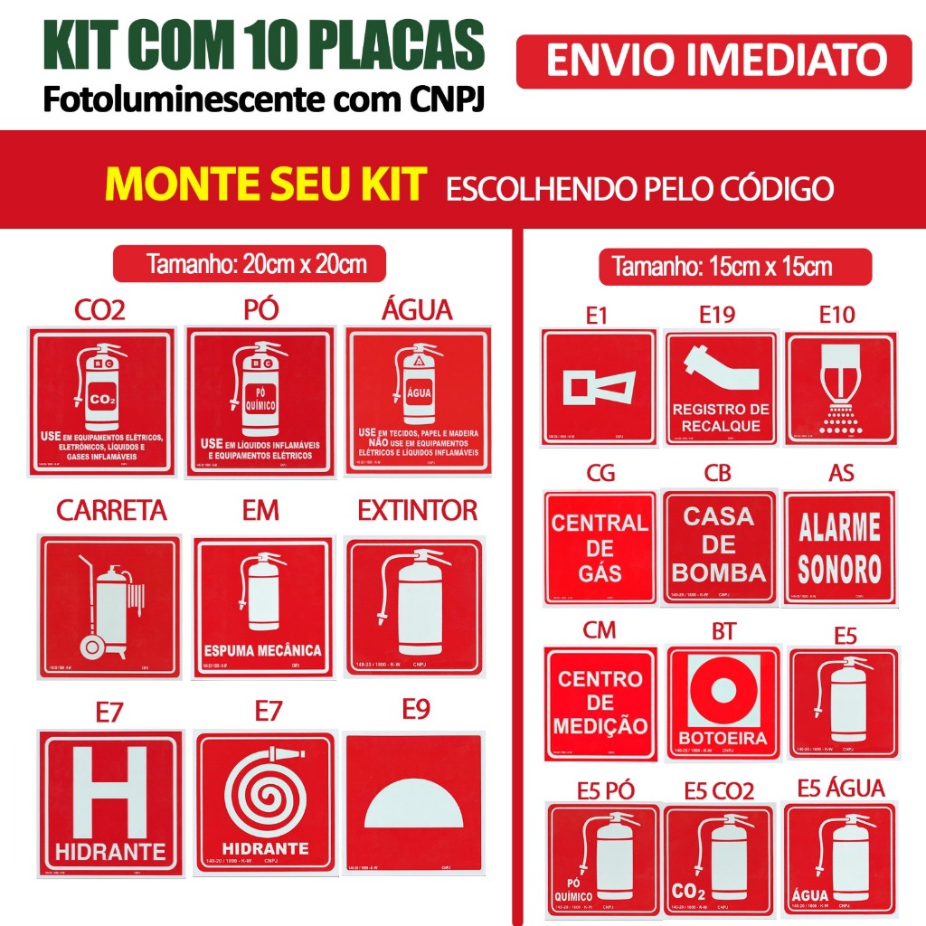 Kit de Placas de Sinalização Fotoluminescente para emergência, rota de fuga, equipamentos de incêndio e placas de alerta. Produto certificado, com CNPJ impresso conforme normas vigentes, garantindo segurança, durabilidade e credibilidade. Passos para realizar sua compra: - Escolha seu kit (quantidade de placas). - Após a compra, envie pelo chat os códigos e as quantidades desejadas de cada placa, conforme as imagens do anúncio. - Seu pedido será separado e enviado com envio imediato. Especificações técnicas: - Tamanhos disponíveis: 24x12cm, 20x20cm e 15x15cm (conforme modelo). - Espessura: 0,7 mm. - Material: resistente ao fogo e retardante de chamas. - Fotoluminescente: 140/20 – 1.800-K-W. Placas verdes 24x12cm (saída e rota de fuga): - Seta Direita (S1) - Seta Esquerda (S2) - Seta Acima (S3) - Seta Abaixo (S3B) - Seta Acima Direita (S4) - Seta Acima Esquerda (S5) - Seta Abaixo Direita (S6) - Seta Abaixo Esquerda (S7) - Escada Desce Direita (S8) - Escada Desce Esquerda (S9) - Escada Sobe Esquerda (S10) - Escada Sobe Direita (S11) - Saída (S12) - Saída Boneco Esquerda (S13) - Saída Boneco Direita (S13-D) - Saída Boneco (S14) - Saída Deficientes Esquerda (S15) - Saída Deficientes Direita (S15D) - Aperte e Empurre (S18) - Saída de Emergência (S22) - Lotação Máxima (M2) - Porta Corta-Fogo (M4) - Escada Pressurizada (M6) - Esta Porta deverá permanecer aberta (M7) - Em caso de Incêndio Não Use Elevador (P4) Placas vermelhas 20x20cm (incêndio e equipamentos): - CO2 – Extintor de dióxido de carbono - PÓ – Extintor de pó químico seco - ÁGUA – Extintor de água - CARRETA – Carreta de combate a incêndio - EM – Extintor de espuma mecânica - EXTINTOR – Indicação geral de extintor - E7 – Mangotinho - E9 – Hidrante de parede - E1 – Mangueira de incêndio - E19 – Chave de hidrante Placas vermelhas 15x15cm (equipamentos): - E10 – Hidrante de coluna - CG – Caixa de gás - CB – Caixa de bomba - AS – Abrigo de sprinklers - CM – Caixa de mangueira - BT – Botão de alarme/manual - E5 – Abrigo de extintor (modelo geral) - E5 PÓ – Abrigo de extintor de pó químico seco - E5 CO2 – Abrigo de extintor de dióxido de carbono - E5 ÁGUA – Abrigo de extintor de água Placas de alerta e proibição: - Perigo linha de gás inflamável - Perigo gás inflamável proibido fumar - Perigo alta tensão - Cuidado risco de incêndio - Alerta geral - Quadro elétrico - Quadro de força - Proibido utilizar o elevador em caso de incêndio - Proibido produzir chama - Proibido fumar conforme lei - Proibido estacionar Vantagens do produto: - Conformidade com normas brasileiras de segurança - Fácil instalação e alta durabilidade - Material fotoluminescente que garante visibilidade mesmo em ausência de luz - Envio imediato com nota fiscal