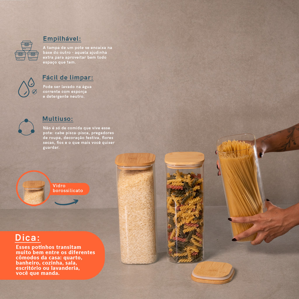 Esse é o KIT DE POTE HERMÉTICO DE VIDRO QUADRADO COM TAMPA DE BAMBU 3 PEÇAS - OIKOS Esse Kit contém: 3 POTES 1,9L DE VIDRO FLAT COM TAMPA DE BAMBU QUADRADO MANTIMENTO – OIKOS Esses são os potes de mantimentos quadrado flat com tampa de bambu da OIKOS. Cabe em qualquer lugar: seu formato quadrado ajuda a aproveitar melhor o espaço - ele encaixa direitinho no canto do armário. Tampa hermética: sua tampa possui um anel de vedação de silicone que veda de verdade! Tampa flat: uma tampa de bambu retinha, fácil de limpar e que fica uma graça na cozinha ;) Mestre da na conservação: a combinação da vedação de silicone com o bambu antibacteriano garante melhor conservação dos alimentos que duram por muito mais tempo. Versátil: não é só de comida que vive esse pote: pisca-pisca, pregadores de roupa, decoração de Natal, nozes, flores secas, fios, jogos e o que mais você quiser guardar - isso que é versatilidade.