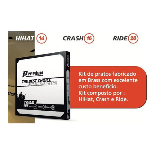 Somos a Eletromusic Loja Especializada a mais de 10 anos no Mercado. Qual e o nosso diferencial? Buscamos sempre oferecer qualidade com excelencia por isso todos os nossos produtos sao de Fornecedores Nacionais com rigoroso controle de qualidade, possuem nota fiscal eletronica e garantia de fabrica. Voce e bem vindo para fazer parte da nossa historia. Com ampla variedade de bancos, ferragens e acessorios, a Premium traz solucoes desde o publico iniciante ate o profissional mais exigente. O Set de prato Premium e otima solucao para o baterista que esta iniciando. Produzido em Brass, o kit e composto por 1 Hi-Hat (chimbal) de 14', 1 Crash (ataque) de 16' e 1 Ride (conducao) de 20'. Caracteristicas Gerais: - Serie: Premium - Codigo: Set Prato Premium 14/16/20 - Material: Brass Especificacoes: - Tipo: Kit - Modelo: Hi-hat / Crash / Ride - Polegada: 14 / 16 / 20 Detalhes: - Acompanha Embalagem Conteudo da Embalagem: -01 Set Prato Premium -04 Feltro para Prato -01 Par Baqueta 5A Outras Informacoes: - Garantia: 03 meses