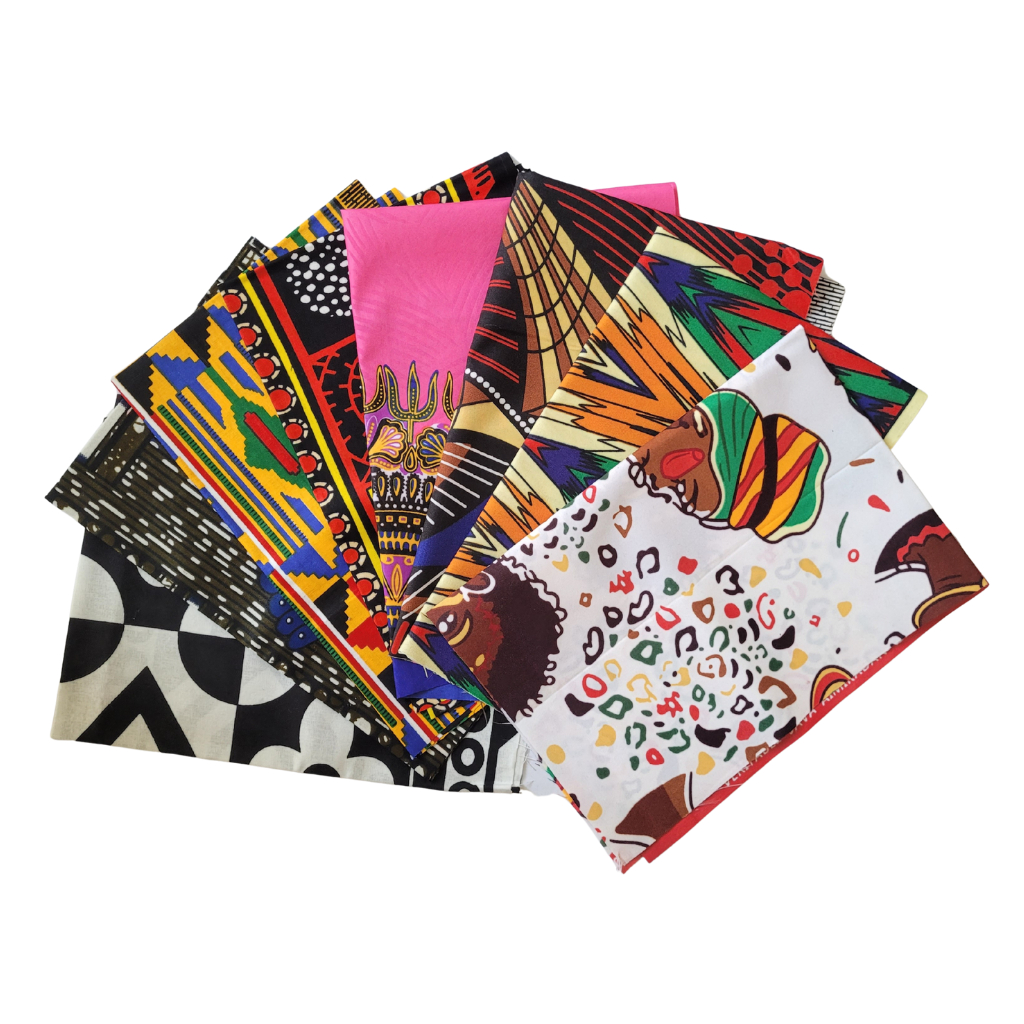Kit de retalhos africanos composto por 8 retalhos de tecido africano no tamanho mínimo de 38 cm por 50 cm. Composição: 2 Retalhos em poliéster e 2 retalhos em algodão. Tecido africano importado de Lagos - Nígeria ou Luanda - Angola. Kit de retalhos é ideal para quem precisa de pequenas metragens de tecido com variedade de estampas, para fazer acessórios, como máscaras, brincos, colares e pulseiras.