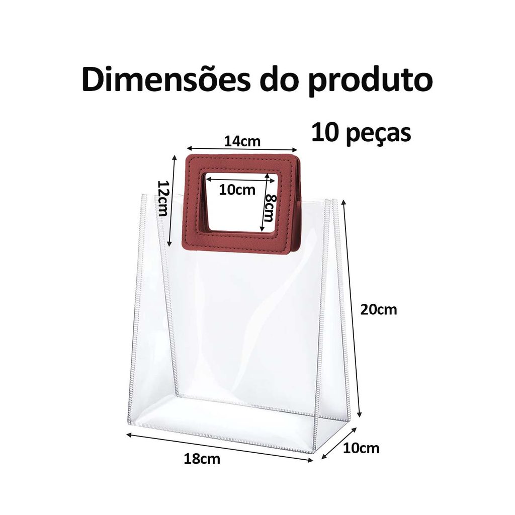 Kit de Sacolas com Quadrado alça para Presente PVC Transparente 20x18x10cm Pacote com 10