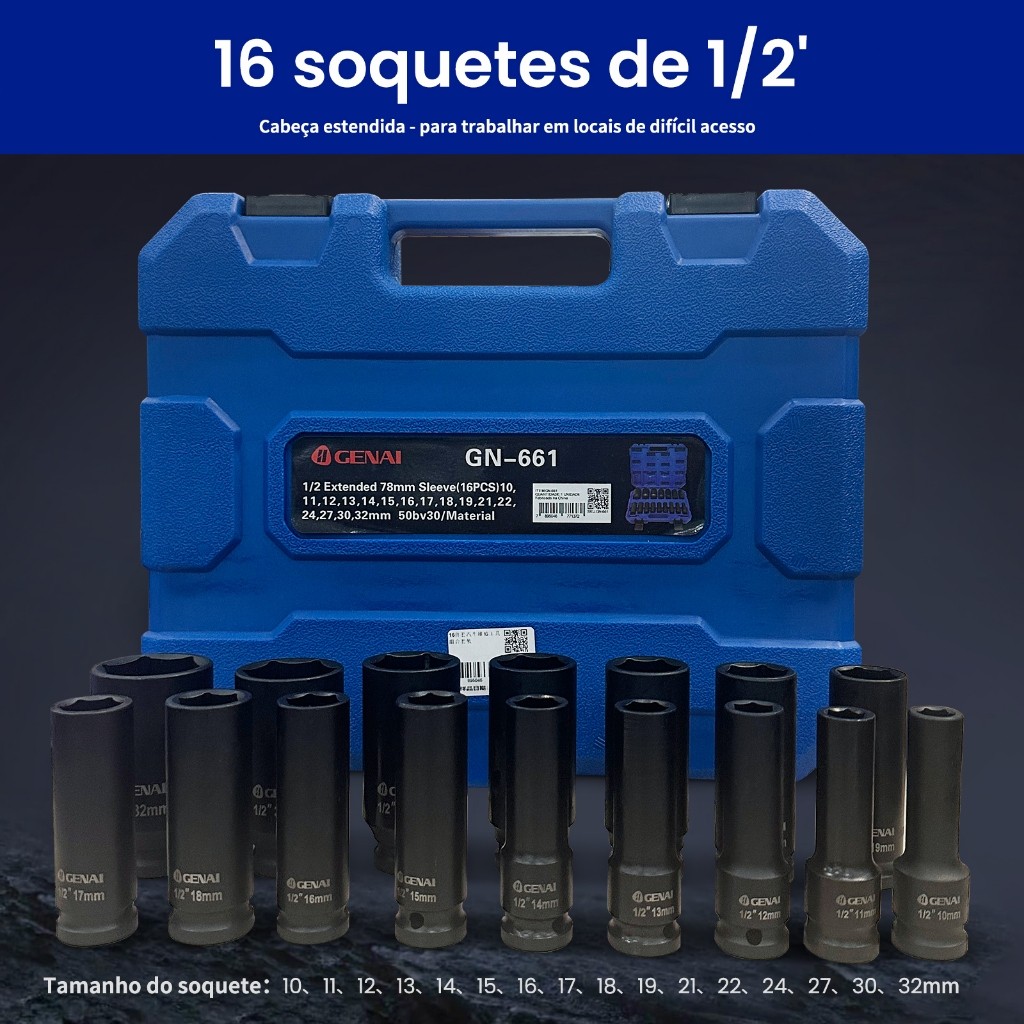 Conjunto de soquetes de impacto de altíssima qualidade, ideal para profissionais e entusiastas de mecânica. Fabricado em material resistente 50BV30, com revestimento anticorrosivo e design de 6 pontos que evita danos aos parafusos. Perfeito para manutenção de veículos, equipamentos industriais e uso em oficinas. Especificações Técnicas: Material: Aço 50BV30 Bitola: 1/2 polegada Haste de extensão: 78mm Tamanhos incluídos: 10, 11, 12, 13, 14, 15, 16, 17, 18, 19, 21, 22, 24, 27, 30, 32mm Revestimento: Anticorrosivo e anti-riscos Design: Transmissão de 6 pontos para maior torque e durabilidade Cenas de Uso: Manutenção automotiva (carros, motos, caminhões) Reparos em equipamentos industriais Uso em oficinas mecânicas e de funilaria Projetos de DIY e manutenção doméstica pesada Acessórios Incluídos: 16 soquetes de impacto 1 haste extensão de 78mm 1 maleta resistente para armazenamento e transporte Marca: GEINAI Modelo: GN-661 Garantia: Resistente a alto torque e impacto, durável mesmo em uso intensivo. Este kit é a solução completa para quem busca precisão, durabilidade e organização em ferramentas de impacto! 🔧🚗💥