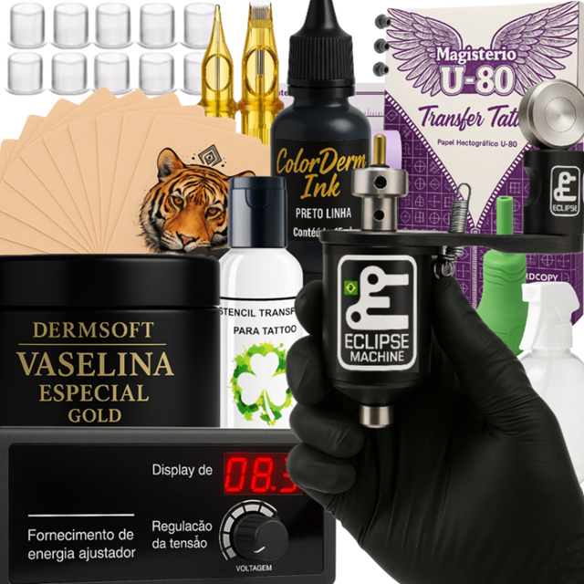 KIT DE TATUAGEM COMPLETO PROFISSIONAL PARA TATUADORES INICIANTES O Kit Tattoo CTC 00 é ideal para tatuadores iniciantes que desejam começar com um conjunto completo e de qualidade. Composto por uma máquina rotativa Eclipse, fonte de alimentação digital, cartuchos com agulhas para traço e pintura, além de diversos acessórios essenciais, este kit proporciona praticidade, eficiência e segurança no aprendizado e na execução das tatuagens. O QUE ACOMPANHA O KIT? Máquina Rotativa Eclipse Fonte de Alimentação Digital 3/12V Tinta Preta 15ml e Vaselina Especial 50g Transfer 60ml para decalque preciso Cartuchos com Agulhas para Traço e Pintura Grip Adaptador Universal para Cartucho Papéis Hectográficos para transferência de desenho 2 Peles de Silicone para Treino 25 Batoques para Tinta Borrifador e Protetores de Cabo Clip Cord Par de Luvas e Grommets de Borracha para Haste Este kit é ideal para quem deseja treinar e desenvolver suas habilidades com praticidade e segurança. Garanta o seu e inicie sua jornada no mundo da tatuagem com um kit completo e de alta qualidade.