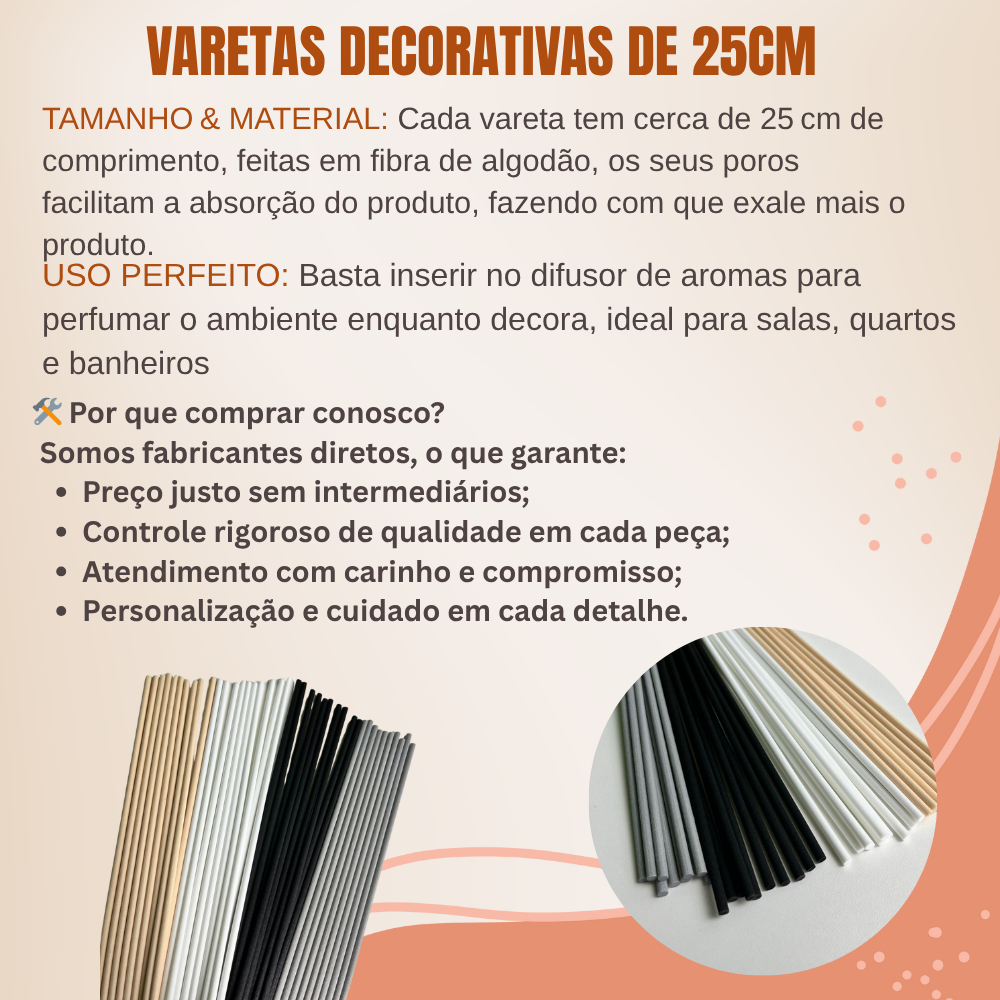 🛍️ Varetas Decorativas para Difusores de Aromas – Arte em Pérolas | Fabricante Oficial ✨ Transforme seus ambientes com charme e elegância! A Arte em Pérolas, fabricante especializada em peças artesanais, apresenta suas exclusivas varetas decorativas para difusores, ideais para perfumar e decorar com estilo! ✅ Descrição do Produto: Produto: Varetas Decorativas para Aromatizadores Tamanho: Aproximadamente 25cm Material : Feltro (fibra de algodão) MAIS ABSORÇÃO E EXALA MAIS SUA ESSÊNCIA Decoração: Acabamentos em pérolas, flores, espirais, strass e detalhes elegantes Cores: Sortidas ou personalizadas conforme disponibilidade 💡 Destaques: Somos fabricantes diretos, o que garante melhor preço e qualidade superior Acabamento artesanal com detalhes em pérolas e acessórios de luxo Ideal para presentear, decorar ambientes e valorizar seus aromatizadores Produzido com carinho por mãos brasileiras 💛 📦 Envio Rápido e Seguro: Embalado com cuidado para preservar a delicadeza das peças Opções de frete econômico e rápido via Shopee
