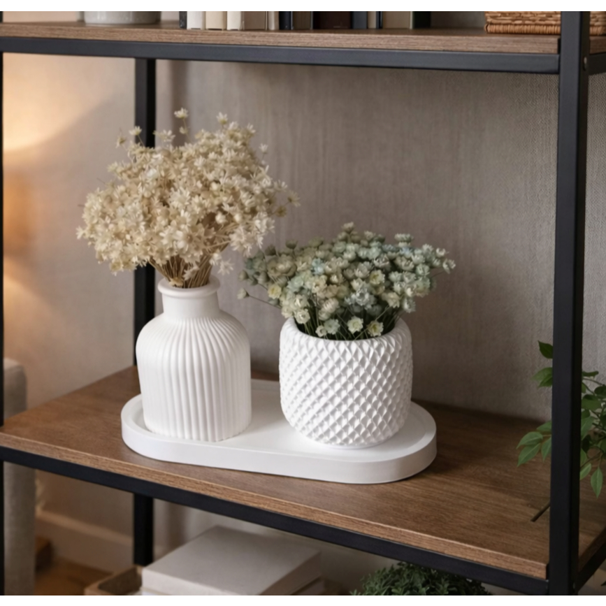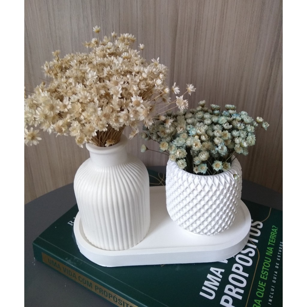 ***Atenção nossas fotos são protegidas por direitos autorais não autorizamos o uso , apenas nossos afiliados estão autorizados Kit decorativo Maya é composto por 3 peças 1 bandeja 9x18 larg x comp 1 vaso 11 cm alt 1 Potiche diamante 7 cm Alt Perfeito para decorar cantinhos , laterias de mesa, mesa de estudos e para compor cenário de fotos. Leia com atenção Todo o trabalho é artesanal , todo material composto por gesso e aditivos, A reação quimica pode gerar pequenas bolhas de ar , natural desse processo, nada que impeça a beleza do produto. Cada peça é possível recriar , pois as peças são cruas permitindo receber verniz pinturas e apliques. Não aconselhamos área molhada, a não ser que seja passada uma camada de verniz a base de água. ATENÇÃO não acompanha as flores. Aguarde o tempo de preparação das peças. E boa decoração