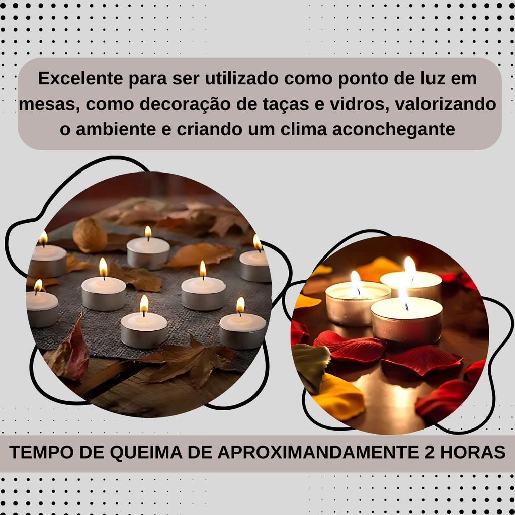 Medias Unitárias: - Altura: 0,9 cm - Largura: 3,5 cm - Duração: 2 horas - Material: Parafina/Metal - Cor: Branca Velas Rechaud com Suporte de Alumínio pode ser uma adição encantadora à decoração do seu casamento ou de qualquer evento especial. Aqui estão alguns benefícios de usar esse kit: Ambiente Romântico: As velas rechaud criam uma iluminação suave e romântica, tornando qualquer ambiente mais acolhedor e atraente. Decoração Elegante: As velas em suportes de alumínio podem ser usadas como peças centrais elegantes em mesas de jantar, criando uma atmosfera refinada e sofisticada. Economia de Energia: Usar velas como fonte de iluminação pode economizar energia elétrica e reduzir os custos do evento. Fotos Memoráveis: A iluminação proporcionada pelas velas cria cenários ideais para fotografias memoráveis, capturando momentos especiais com uma luz suave e aconchegante. Sustentabilidade: Ao escolher velas rechaud, você está optando por uma opção mais sustentável em comparação com iluminação elétrica, reduzindo a pegada de carbono do seu evento. Criação de Atmosfera: As velas rechaud são conhecidas por criar uma atmosfera relaxante e romântica, o que pode ser especialmente benéfico em eventos como casamentos, jantares românticos ou festas. Lembre-se de que, ao usar velas em eventos, é importante considerar a segurança. Certifique-se de posicionar as velas de forma segura, longe de materiais inflamáveis, e supervisione-as durante todo o evento para evitar acidentes. Com um kit de 100 ou 50 Velas Rechaud com Suporte de Alumínio, você pode criar uma atmosfera memorável e agradável para o seu evento especial.