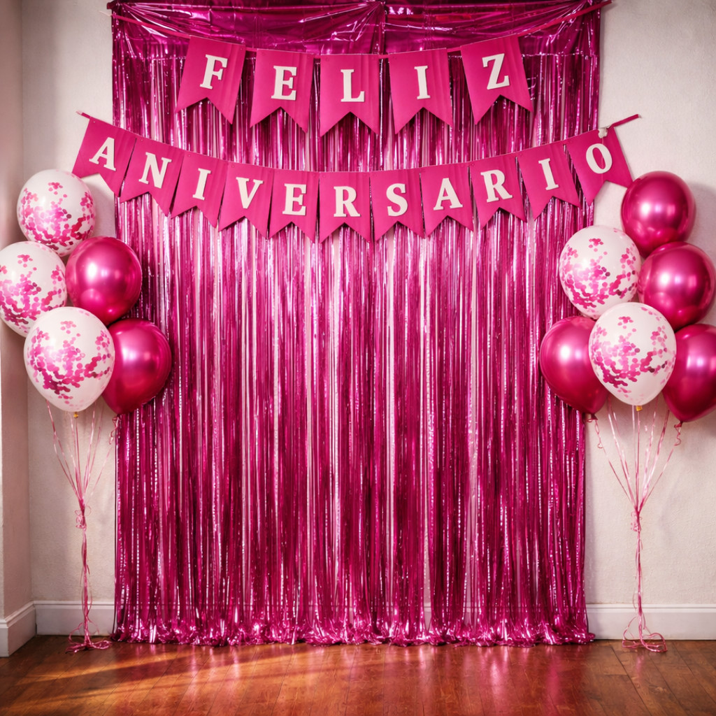 Kit Decoração Aniversário Pink Completo – Cortina Metalizada 2x1m + Faixa Feliz Aniversário