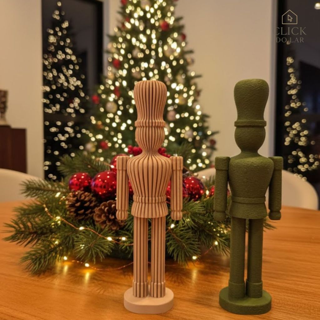 Apresentamos nosso Kit Exclusivo de Decoração Natalina em PLA, produzido através de impressão 3D de alta precisão. Cada peça possui acabamento detalhado, design moderno e linhas elegantes, trazendo charme e sofisticação para a decoração de Natal. Todos os itens são feitos em PLA, um bioplástico sustentável e ecológico, resultando em peças leves, resistentes e perfeitas para uso interno. 🌲 ÁRVORES DE NATAL (2 unidades) Altura árvore pequena: 15 cm Altura árvore grande: 20 cm Design composto por esferas modeladas que criam um efeito visual único e sofisticado. 🦌 RENAS DECORATIVAS (2 unidades) Rena pequena: 13,5 cm Rena grande: 17,5 cm Peças com linhas verticais marcadas e chifres delicados, trazendo elegância e modernidade ao ambiente. 🎁 QUEBRA-NOZES DECORATIVOS (2 unidades) Altura de cada peça: 21 cm Textura linear e design minimalista reinterpretam o clássico Quebra-Nozes de forma contemporânea e estilizada. 🖨️ MATERIAL E ACABAMENTO Produzidos em PLA (bioplástico sustentável) Impressão 3D de alta precisão Acabamento fosco e texturizado Produto artesanal, exclusivo e decorativo ✨ IDEAL PARA: Sala de estar Mesa posta Aparadores e estantes Lojas, recepções e escritórios Presentear no Natal Compor cenários natalinos modernos e minimalistas