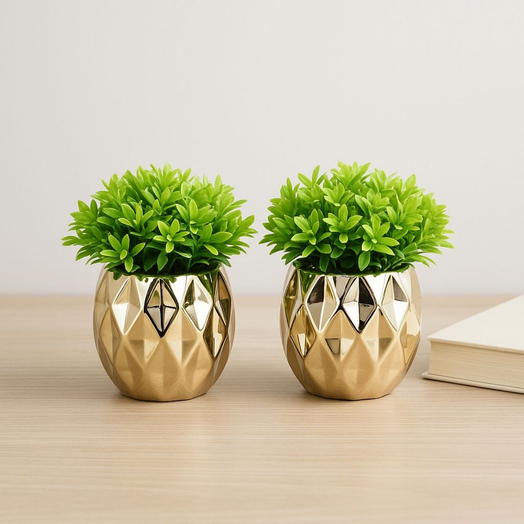 Kit Decoração Enfeite 2 Vasinhos Dourado + Planta Artif.