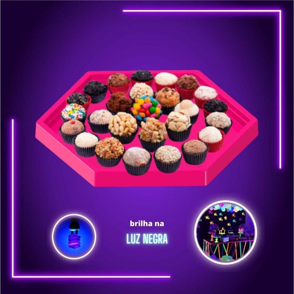 Kit Para Decoração de Mesa Neon Contém: 1 Boleira 22cm 2 Vasos Gregos 2 Bandejas Para Docinhos 1 Bandeja Sextavada Para Docinhos Brilha na Luz Negra Escolher a cor na variação do anúncio. O kit sortido será enviado colorido de forma aleatória. Ótima qualidade Cores Vibrantes Produtos à pronta entrega